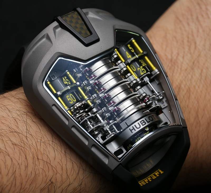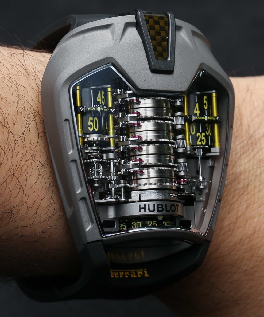 操作 Hublot MP-05 LaFerrari 是另一項獨特的嘗試。該表殼沒有表冠或任何類型的調節器。事實上,要給手表上弦或設置時間,您需要輔助設備。我們在去年的原始 LaFerrari 手表文章(鏈接到上面)中有一張它的照片。它是宇舶表隨附的電鉆式工具。它連接到表殼頂部的端口,用于設置時間或為機芯上弦。為什么要用電鉆?好吧,否則用手上弦會花費太長時間!