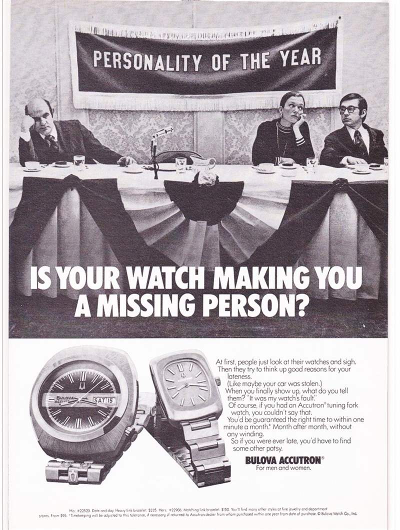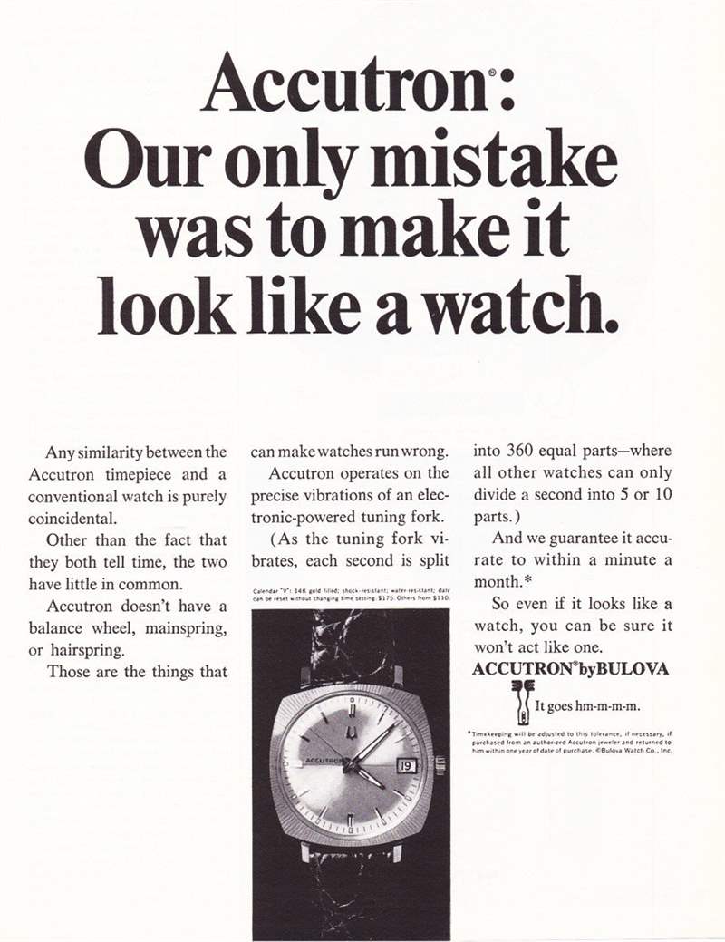 在《廣告狂人》中,出現了一些與 Bulova Accutron 以及與此相關的所有豪華手表的營銷相關的問題。演講超越了手表的單純實用性,并描述了如何使手表成為話題的理想方法。這個想法是聰明、有趣、成功的人佩戴 Bulova Accutron 手表,人們會詢問他們。同樣在今天,鐘表的實用性已經減弱,取而代之的是它們的地位或裝飾價值。這并不是說鐘表沒有功能,而是人們通常需要一個次要理由來佩戴價格較高的鐘表。廣告留言廣告信息結束