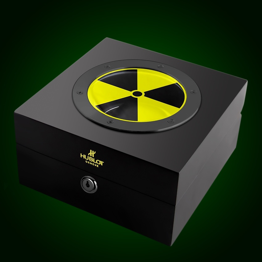 Hublot 決定將 Atomic D-38 基于其新的 45 毫米寬更新 Big Bang 表殼,并開發(fā)一種特別適合手表放射性特性的獨(dú)特復(fù)雜功能。Hublot 理解,甚至建議訂購 Atomic D-38 的顧客不要一直佩戴它。事實(shí)上,就像陳年烈酒一樣,一次只能喝少量。當(dāng) Big Bang Atomic D-38 腕表不使用時(shí),宇舶表提供了一個(gè)鉛質(zhì)展示盒,用于存放未佩戴的腕表,以保護(hù)兒童和動(dòng)物的生命安全。