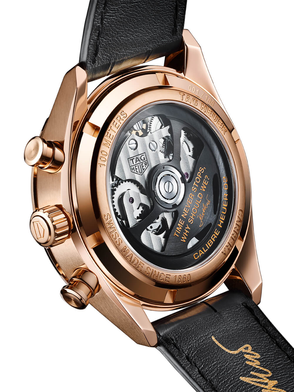 透過底蓋,您可以看到豪雅 (Tag Huer) 卓越的 Calibre Heuer 02 自制計時機芯,該機芯采用垂直離合導柱輪,確保在操作計時碼表時實現絲般順暢的換檔,而自動上鏈擺陀上刻有杰克豪雅的格言:“時間永遠不會停止,我們為什么要停止?” 作為最后的繁榮,生日黃金限量版將采用黑色皮革鱷魚皮表帶,底部飾有杰克豪雅 (Jack Heuer) 的簽名。這款慶祝手表將限量發售 188 款,售價 15,300 英鎊。