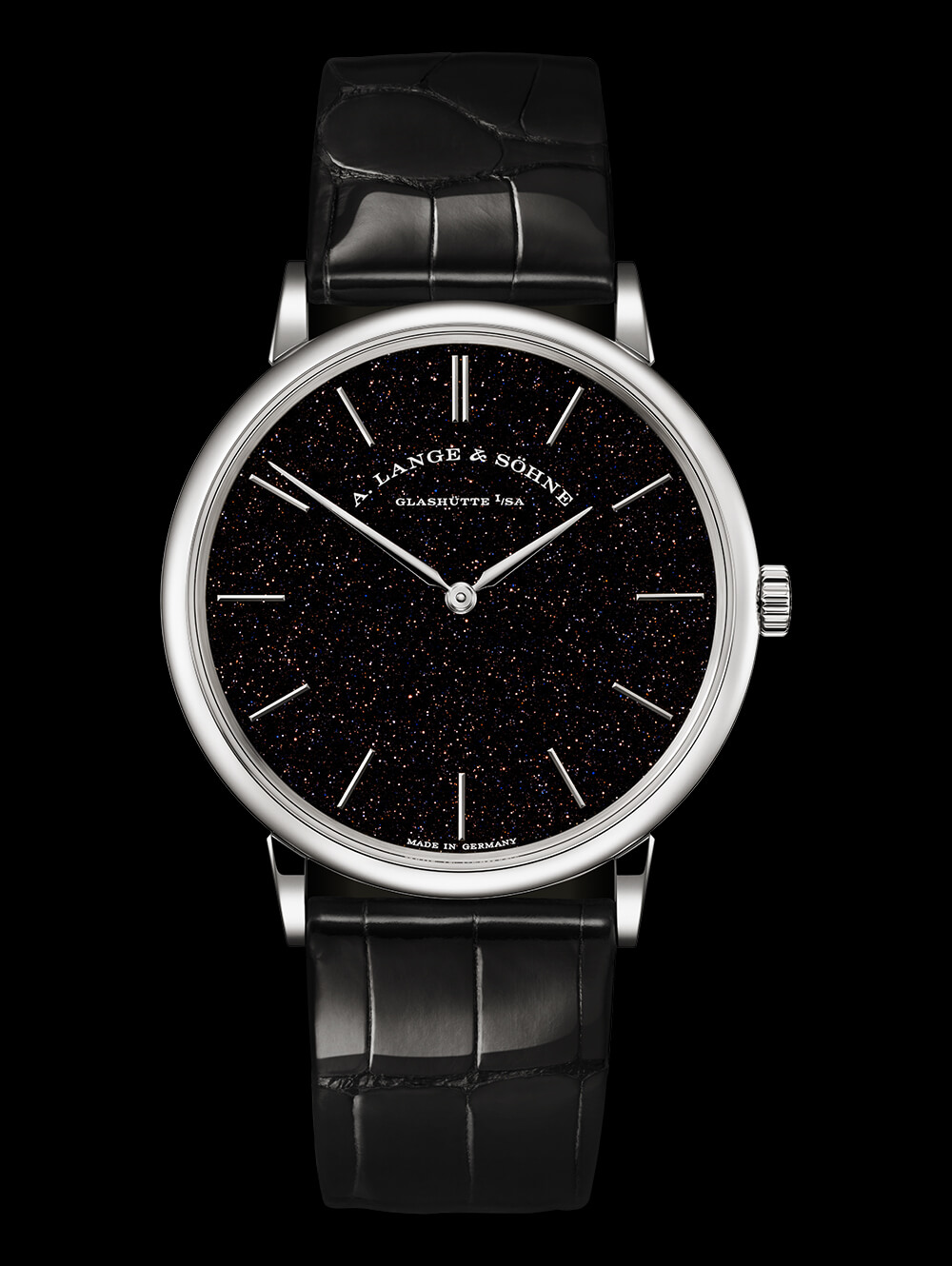這種材料以眾多名稱而聞名,包括 Goldstone 和 Gold Flux,這是朗格自 2018 年生產首款此類表盤以來一直使用的名稱,即帶有藍色 Aventurine 表盤的 Saxonia Thin。Blue Aventurine 經常被用來制作以天文為靈感的手表的表盤,其中銅內含物與深藍色玻璃相映成趣,從而相當忠實地再現了夜空。