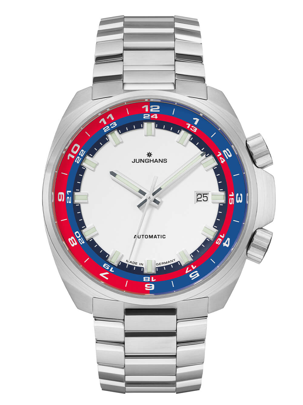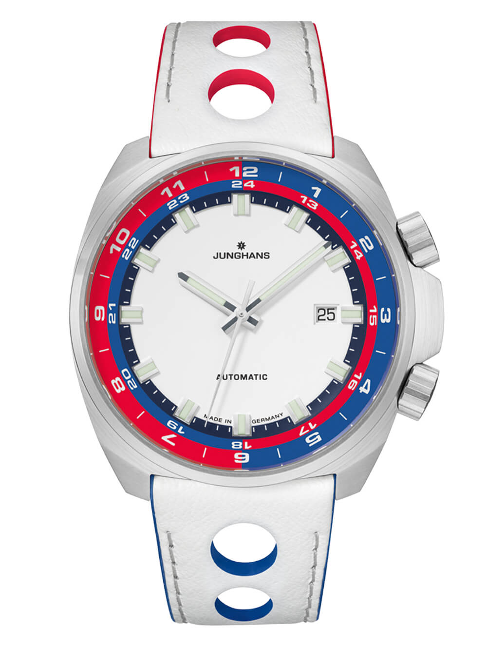 恰如其分的雪白表盤搭配亮藍色和紅色第二時區(qū)內表圈,可通過 2 點鐘位置的表冠進行操作。您可以更清楚地分辨表冠之間的區(qū)別,因為 2 點鐘位置的表冠上飾有雪花,而用于設置時間的 4 點鐘位置表冠則使用了榮漢斯星。你知道,如果他們的立場不夠容易的話。