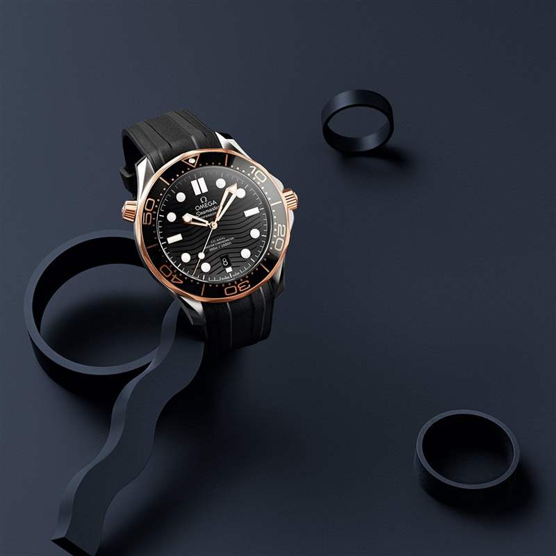 從最入門的海馬系列 300米潛水表43.5毫米至臻天文臺黑色陶瓷表殼搭配橡膠表帶款開始,該表的首發選擇在線上,可見其深得年輕一代買家的歡心。該表表殼采用黑色氧化鋯[ZrO2]陶瓷和 Sedna 18K金制成,黑色陶瓷表盤采用激光燒蝕技術,浮雕有波紋圖案。拋光Sedna 18K金小時刻度和指針切面均覆有白色 Super-LumiNova 夜光涂層,偏紅的色澤與黑色表盤形成鮮明對比。一體式黑色橡膠表帶搭配黑色陶瓷表扣,令該表外觀更加精美雅致,也與其潛入深海的功能搭配和諧。