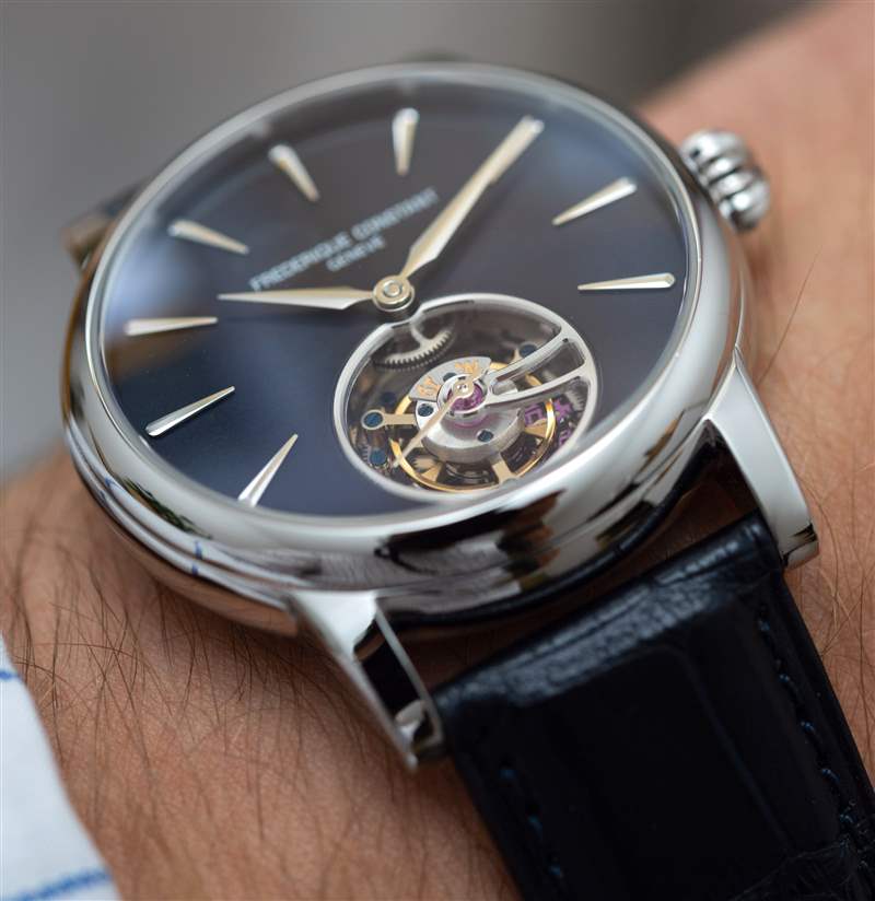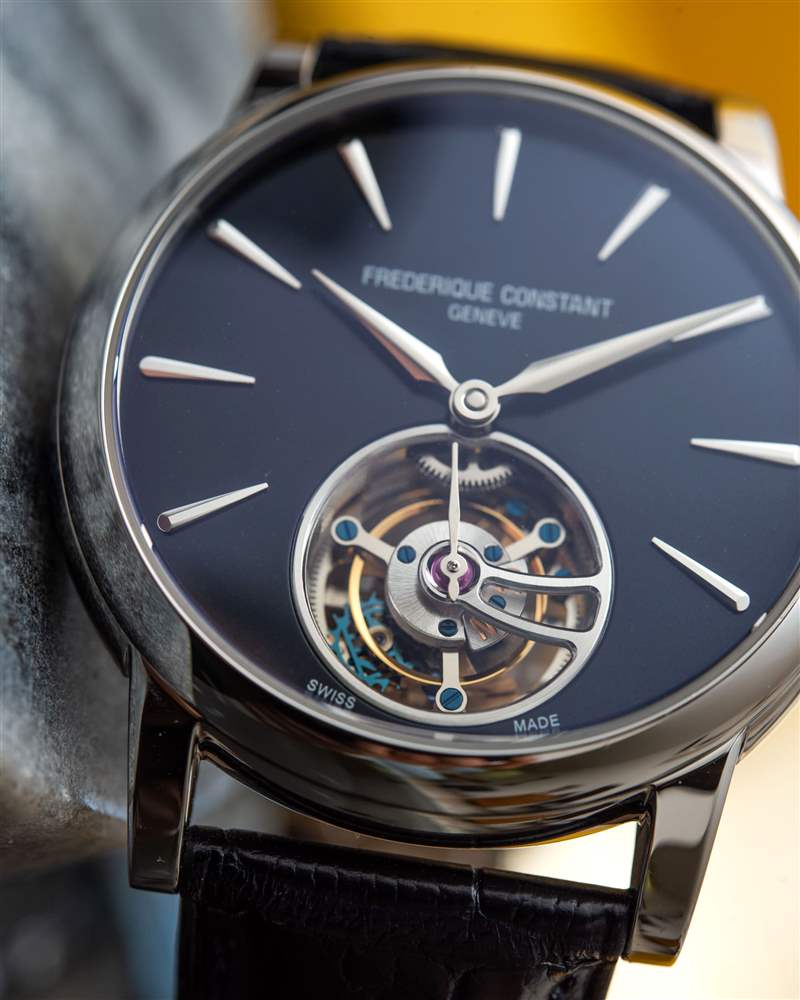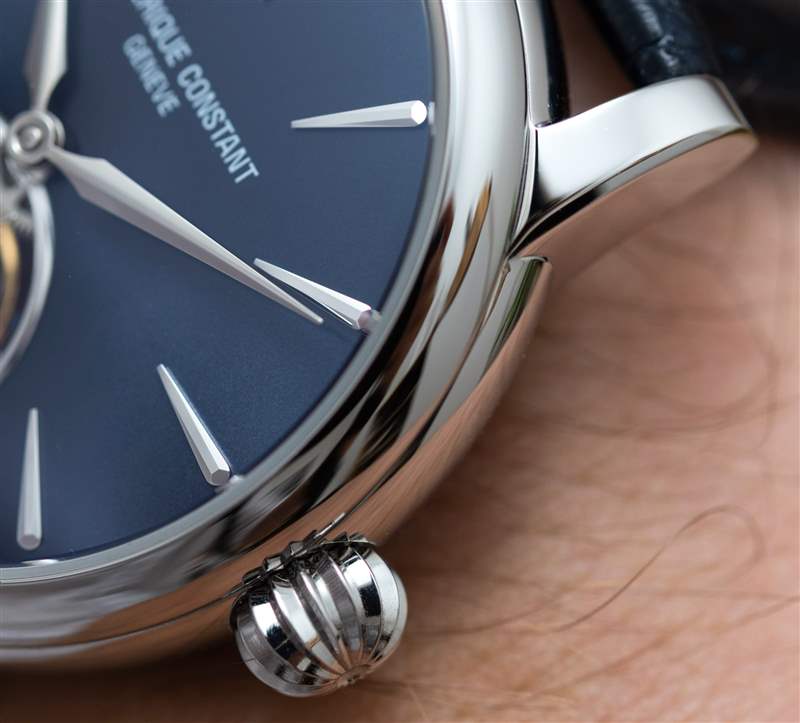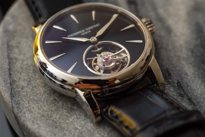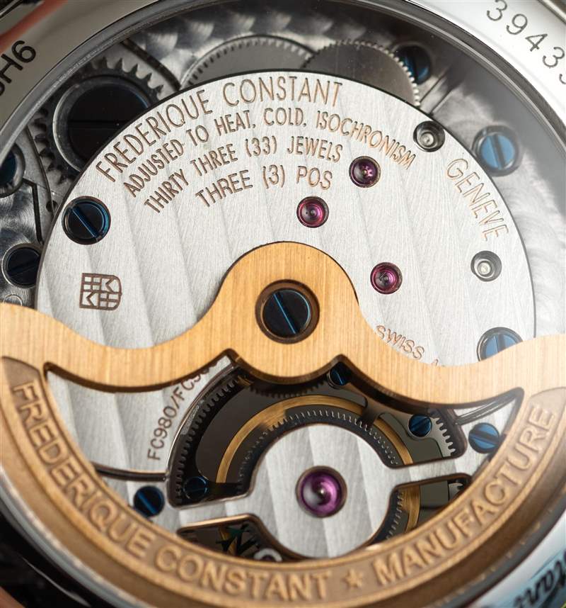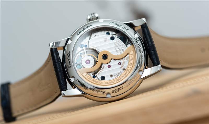 巨大的指針以其體積、復(fù)雜的形狀和明顯的縱向彎曲給人留下了深刻的印象。它們也是 FC-980 自產(chǎn)機(jī)芯的力量展示,該機(jī)芯不僅承載著巨大的時(shí)針和分針,還承載著陀飛輪組件。動(dòng)力儲(chǔ)存只有區(qū)區(qū)38小時(shí),很短,但至少是自動(dòng)補(bǔ)充的。FC-980機(jī)芯調(diào)校為熱、冷、等時(shí)、三方位,但沒(méi)有說(shuō)明是否是經(jīng)過(guò)認(rèn)證的天文臺(tái)表。