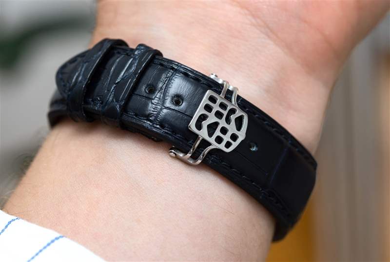 戴在手腕上,自制經(jīng)典陀飛輪腕表給人一種真正優(yōu)雅的感覺(jué),專為日常佩戴而設(shè)計(jì)——也就是說(shuō),在辦公室里日常佩戴。這不是“看看這個(gè)!”?陀飛輪的展示只是為了將其置于敲詐比特幣百萬(wàn)富翁沖動(dòng)購(gòu)買者的范圍內(nèi)。這是一款相對(duì)低調(diào)、內(nèi)斂的手表,看起來(lái)復(fù)雜而昂貴,但絕不令人討厭或礙眼。人們很容易想象跨國(guó)公司的高級(jí)經(jīng)理或工程師會(huì)穿著它。簡(jiǎn)潔的細(xì)節(jié)包括,單個(gè)生產(chǎn)編號(hào)不僅可以在底蓋上讀取,還可以在陀飛輪框架的頂部讀取——功能性機(jī)芯組件具有如此程度的定制是很少見(jiàn)的。擒縱輪上刻有康斯登標(biāo)志,閃爍著紫色和藍(lán)色的光芒,這是因?yàn)樗怯晒柚瞥傻摹T撈放剖褂玫牟粌H僅是這個(gè)組件 – 了解他們的 40Hz(是的,四十赫茲)這里采用硅制成的整體式擒縱機(jī)構(gòu)。折疊扣上還帶有品牌標(biāo)志,這是一個(gè)不錯(cuò)的主意,盡管執(zhí)行起來(lái)并不像某些人想象的那么清晰。