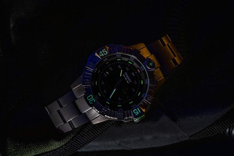雖然 Traser 手表以其 Trigalight 氚充氣管而聞名,但該品牌并不回避使用光反應發光材料,而 Traser P99 T Tactical 將兩者混合到其低光顯示屏中。氚管出現在所有三個指針以及每個 12 點鐘標記上,雖然 P99 T Tactical 上的絕大多數發光材料發出綠色光,但這些管子位于 12 點鐘標記處和 12 點鐘標記內。秒針均發出橙色光,以提供卓越的一目了然的對比度。另外兩個氚管出現在表盤上半部分的 Traser 標志內,而另一對氚管以十字線形式放置在表圈零標記內的密封膠囊內。