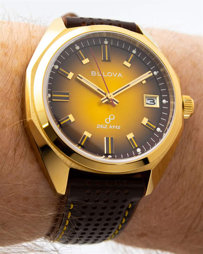 雖然 Bulova Jet Star 的表盤布局可能相對簡單,但正是這種簡單設計的執行使表盤脫穎而出。不銹鋼型號有深梅洛紅或限量版銀色可供選擇,但我們的金色評測型號配備了豐富、時髦的“奶油糖果”表盤配色。與傳統的明亮黃金色調不同,這款略帶紋理的旭日紋表盤以接近純蜂蜜顏色的近乎琥珀色色調開始。由于表盤的漸變效果,外部分鐘刻度逐漸變成深巧克力棕色,從而在表盤上呈現出美妙的暖色調。它一點也不微妙,就像巴里·吉布 (Barry Gibb) 身上的聚酯纖維西裝一樣,大約是 70 年代的風格,但這帶來了自己品牌的引人注目的魅力。簡單的條紋棒形指針和配套的棕色涂層立體時標避免了這種外觀過于復雜的情況,并牢牢地植根于其 70 年代祖先的背景,旁邊的 12 點鐘位置印有老式 Bulova 標志。一些純粹主義者可能會對 3 點鐘窗口使用白色日期輪表示不滿,但這在很大程度上也是正確的。稍微偏離表盤感覺的是紅色針秒針。這款指針每秒 16 次的流暢掃描與通常每秒一次的石英秒針相比是一個有趣的變化,但紅色調可以說太亮又太柔和,不適合真正的設計。雖然黑色或深棕色秒針可以干凈利落地融入整體調色板,寶路華 (Bulova) 的紅色顏色太暗、太柔和,無法真正形成有效的對比效果。更具活力的猩紅色很可能解決這個難題,同時保持當前風格不變。