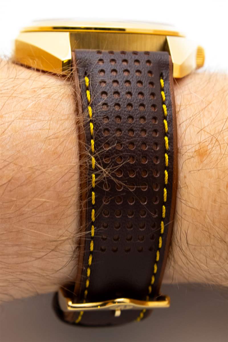 雖然不銹鋼表殼的 Bulova Jet Star 型號提供不銹鋼多鏈式表鏈和表帶選項,但金色款式僅限于桃花心木棕色小牛皮拉力風格表帶。這條表帶非常適合捷星航空的復古氣質,帶有黃色縫線和溫暖的底色,但皮革本身可以給人一種制服的感覺。皮革表帶的質感和特色可能會更適合表盤,但就其價格而言,它是一條堅固的表帶。廣告留言廣告信息結束