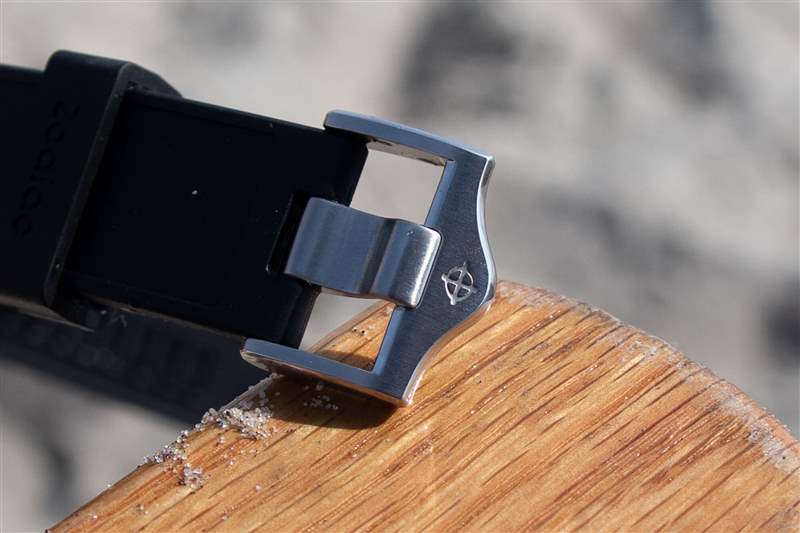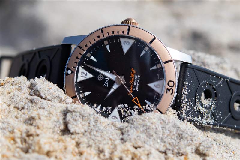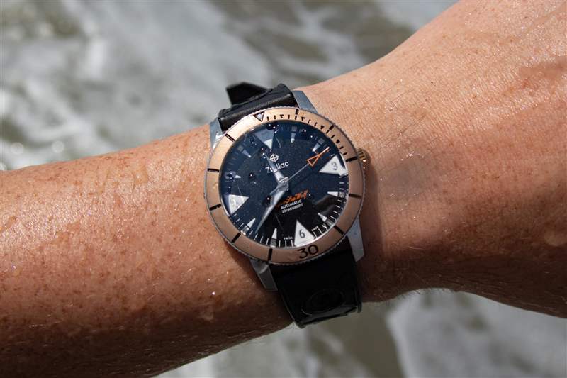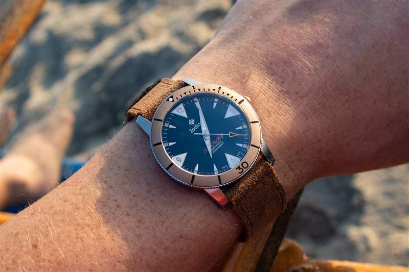 當然,我從來沒有擔心過手表在海洋或我們租的房子的游泳池中的安全性(盡管你不會想知道,我五歲的孩子更喜歡游泳池,而他更年輕但更大膽的弟弟很快就熱情起來了)并首選海洋)。該腕表配備與表圈相匹配的青銅旋入式表冠,帶有 Zodiac 標志,以及纖薄但易于抓握的脊狀部分,有助于提供 200m 的防水性能。此外,雖然我沒有用麂皮表帶冒險進水,但將橡膠表帶牢固地固定到位的扭結帶扣讓我感到很安慰。