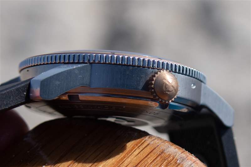 當天晚些時候,我改用了隨附的黑色天然橡膠表帶,這需要一個工具(顯然我隨身攜帶),因為表帶沒有快速釋放桿。這一變化還提供了一個以完全不同的角度體驗這款手表的機會。黑色橡膠完全改變了手表的感覺,從休閑和戶外,到運動和目標明確,也許更適合海洋。青銅表圈沒有被表帶帶出,而是粒狀黑色表盤突出。表帶沒有改變的是手表戴在手腕上的舒適度。憑借現代的直徑、12.6 毫米的厚度和 46.5 毫米的表耳間距,佩戴這款腕表毫不費力。
