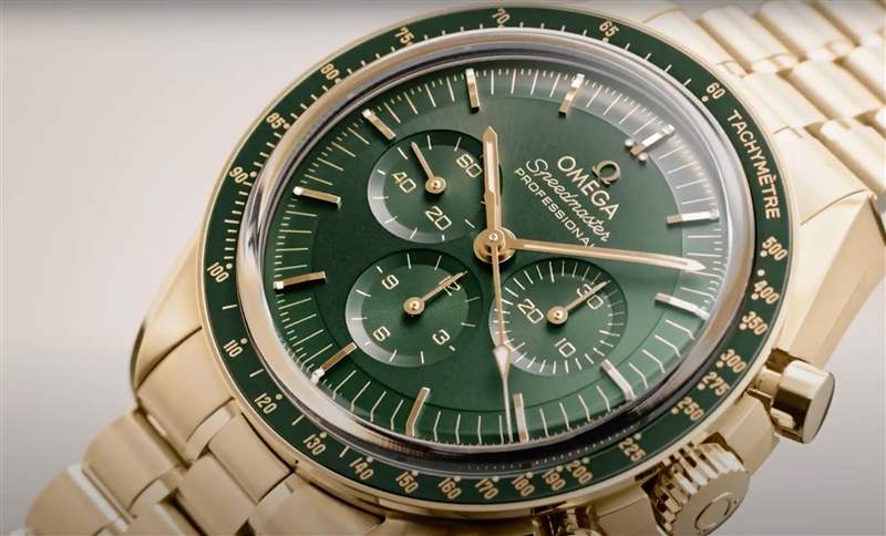當然,對于歐米茄超霸系列來說,專業月球表代表著該系列的「靈魂」,從1969年首次登月以來,此后人類歷史上迄今為止所有的登月任務中,它都伴隨著宇航員們活動于月球之上。時近年末,超霸系列專業月球表 Moonshine 18K金款,金殼金帶其閃耀的光澤仿佛深邃夜空中的皎潔月光,尤其地高雅脫俗。這款腕表有 Moonshine 18K金表盤或經過PVD處理的綠色表盤可供選擇,不同色彩自有不同的味道。值得一提的還有全新表款所沿襲的第4代超霸登月表的設計風格,其突出的特點正是測速計刻度上呈現出早期超霸表款的‘Dot Over Ninety’(刻度90的圓點位于數字上方)風格,藏家與鑒賞家尤其喜歡這樣的細節。