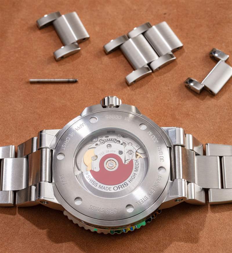 鑒于手鏈如此厚實,表耳處的寬度為 24 毫米,為了佩戴舒適,它明顯變窄。我確實喜歡手鐲端耳的樣式,當然,Oris Aquis 的可用橡膠表帶也有類似的體驗。話雖如此,但大自然有專有設計,如果您不想使用 Oris 提供的表帶或手鏈,則只能使用 Oris 或其他特殊形狀的表帶和手鏈。