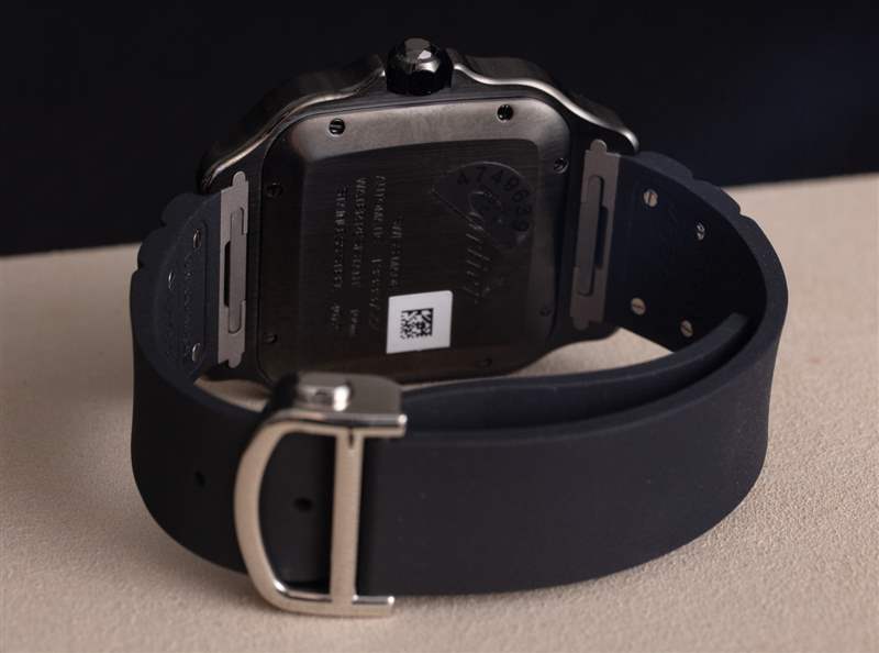 當然,這并不是表盤元素也是黑色的意義上的“全黑”手表。卡地亞通過將表針和羅馬數(shù)字時標涂上白色夜光來確保 Santos WSSA0039 也清晰易讀。與上一代 Santos 100 Carbon 上的運動型紅色秒針不同,這款黑色 Santos 的單色個性以今天的標準來說更加時尚和現(xiàn)代。表殼和橡膠表帶螺絲采用拋光鋼制成,為手表增添了一點卡地亞風格。效果是讓它們稍微捕捉到光線,從而更好地吸引眼睛到手表上。因此,您有隱形手表的外觀,盡管這款 Santos 非常引人注目。表冠上有一顆黑色尖晶石凸圓形寶石。