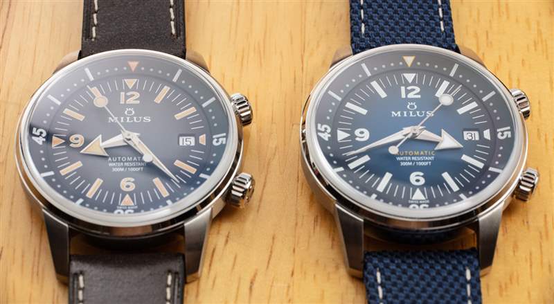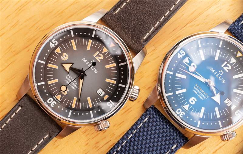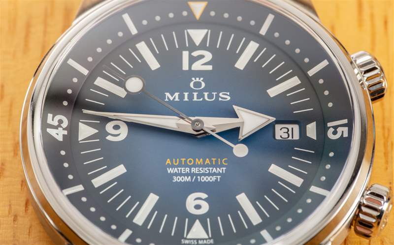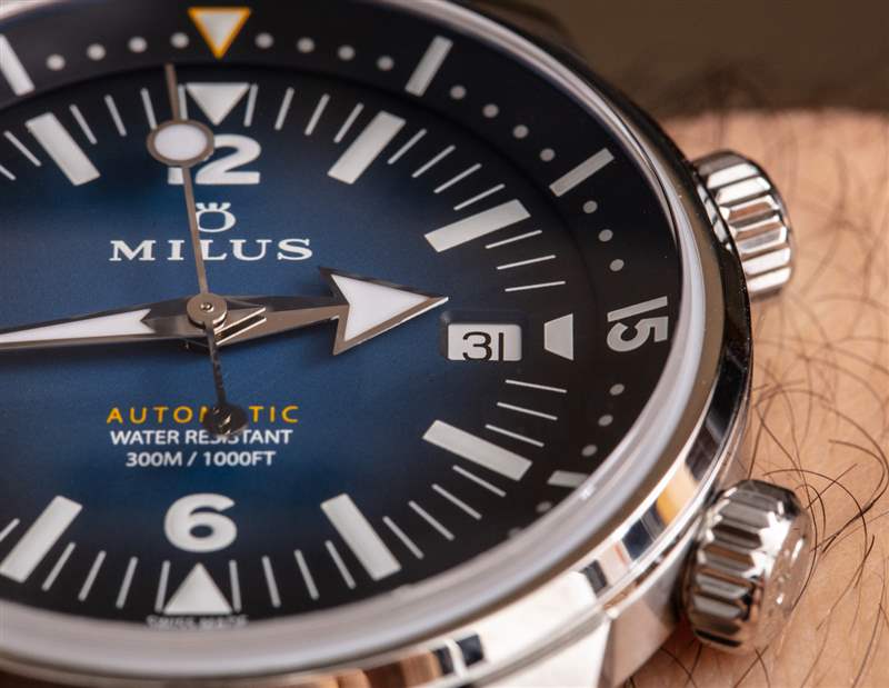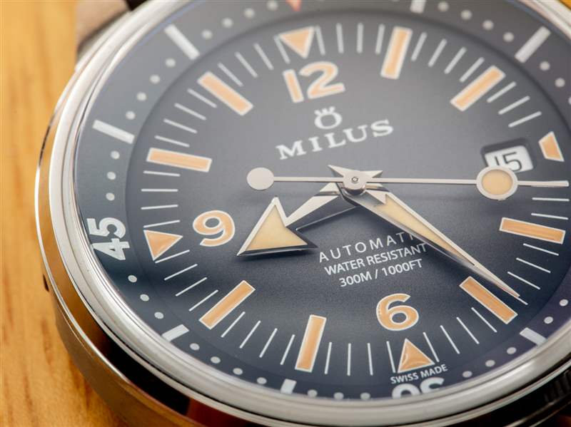 Milus Archimedes 表盤上沒有多少原創感,但這是手表最強大的部分,有助于增加其性感魅力。我真的很喜歡手,既清晰又拋光。這些形狀使它們脫穎而出,它們是寬箭頭式時針,太妃分針和大橄欖棒秒針。表盤標記上涂有豐富的夜光漆,并且肯定具有復古潛水表的氛圍。臉部本身有一點顏色漸變,正如您在圖片中看到的那樣,Milus 目前提供 Milus Archimedes Blue 和 Milus Archimedes Black。具有諷刺意味的是,阿基米德黑主要是棕色,而米盧斯阿基米德藍中的黑色比黑色更多。我將它們重命名為 Archimedes Dark & Stormy 和 Archimedes Depth Blue。