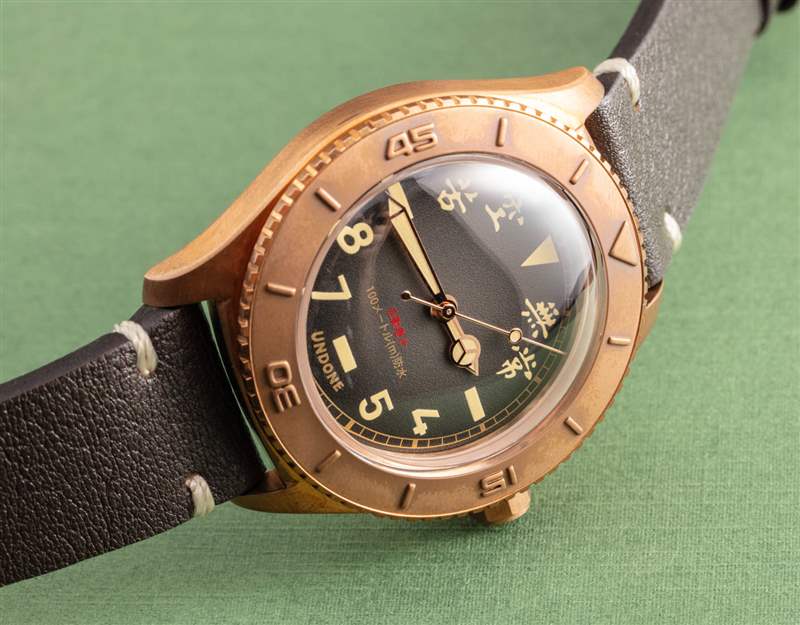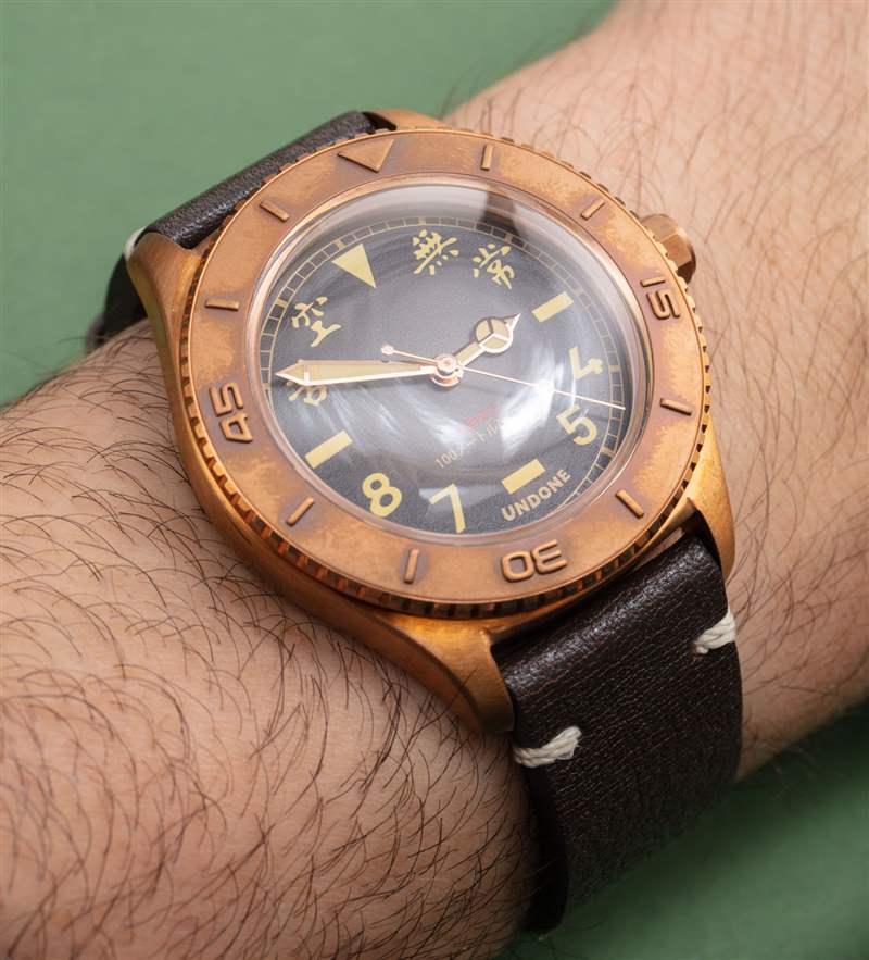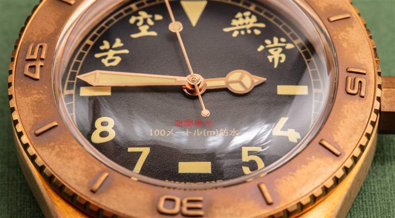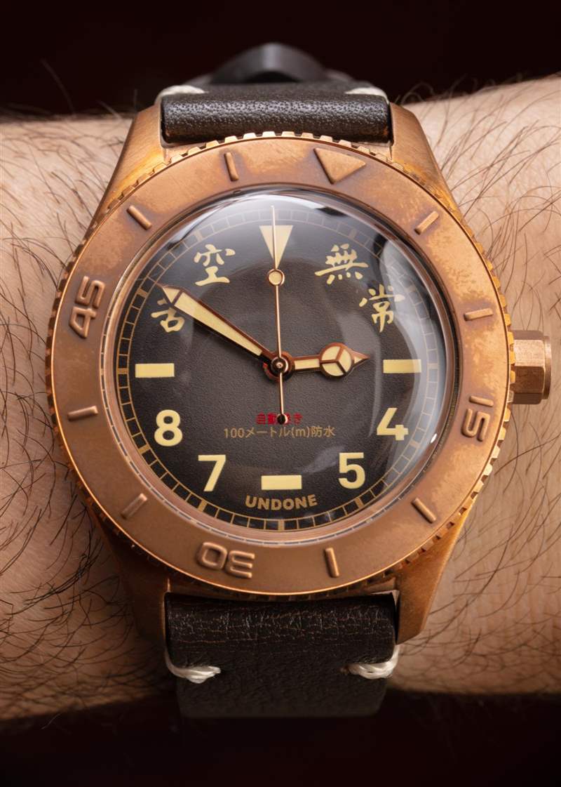 不到一年后,Undone 更新了 Basecamp(Undone Basecamp 2.0 在 aBlogtoWatch 上觀看這里) 具有一些附加功能,例如更多的防水性和其他調整。從那時起,大本營(連同 Urban)一直是 Undone 應用其大部分創意的地方。這款特別的 Basecamp “Kyoto Ghost” Bronze 手表是四款不同(盡管相似)手表系列的一部分,這些手表將青銅表殼引入 40 毫米寬的 Basecamp 表殼。其中兩款 Basecamp Bronze 腕表以日本為主題,采用新穎的“加利福尼亞”表盤,將羅馬數字時標的上段替換為日文漢字字符。據說這里的文字是對佛教教義的一種認可,這些文字翻譯為“存在、無常、痛苦和無自性”。換句話說,這些手表旨在幫助佩戴者從社會人類生存的壓力中“釋放”。廣告訊息廣告信息結束