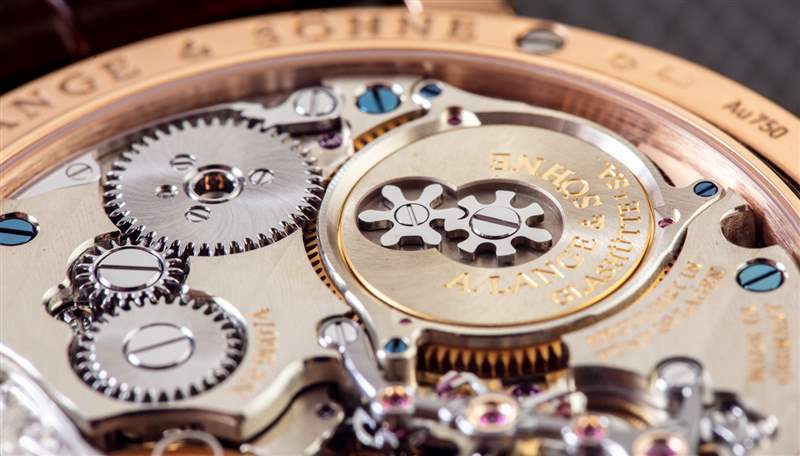 由 528 個零件制成的 L043.2 機芯在視覺上令人驚嘆。與其他朗格 (A. Lange & Sohne) 機芯一樣,該機構不僅完全由手工裝飾,而且一旦機芯最初組裝,就會被拆開、檢查,然后重新組裝。我在上面提到了該機制如何包括恒力擒縱系統。這樣做的目的是確保從為手表提供動力的主發條盒為運行報時系統的齒輪系提供更加一致的動力量。通過表殼后部可以直觀地看到恒力機制在發揮作用,因為它會產生動力,然后以一致的脈沖將動力傳遞給齒輪系。該機芯由德國銀制成(隨著時間的推移會形成迷人的銅綠),并使用大量高端功能,