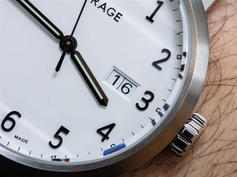 在設(shè)計方面,表殼并沒有太努力,但它確實有一些有趣的線條和視覺技巧,使它脫穎而出,不像另一只圓形包豪斯風(fēng)格的手表。我真的很喜歡突出而清晰的黑色涂層金屬指針,它與這個版本的 Omnium 蛋殼白表盤形成鮮明對比。就其個性而言,小時標(biāo)記有點“掛鐘”,但整體表盤非常易于閱讀且制作精美。