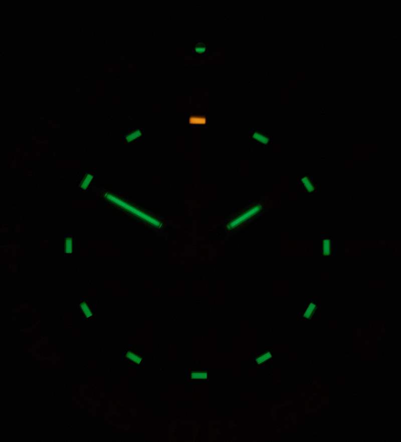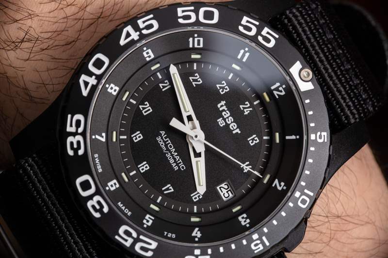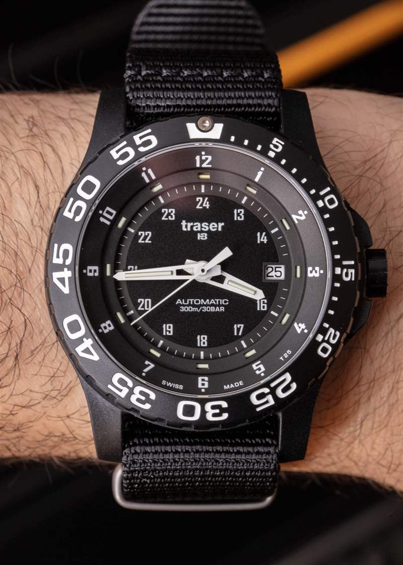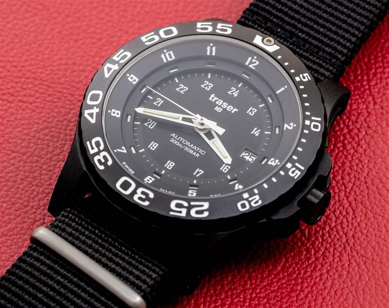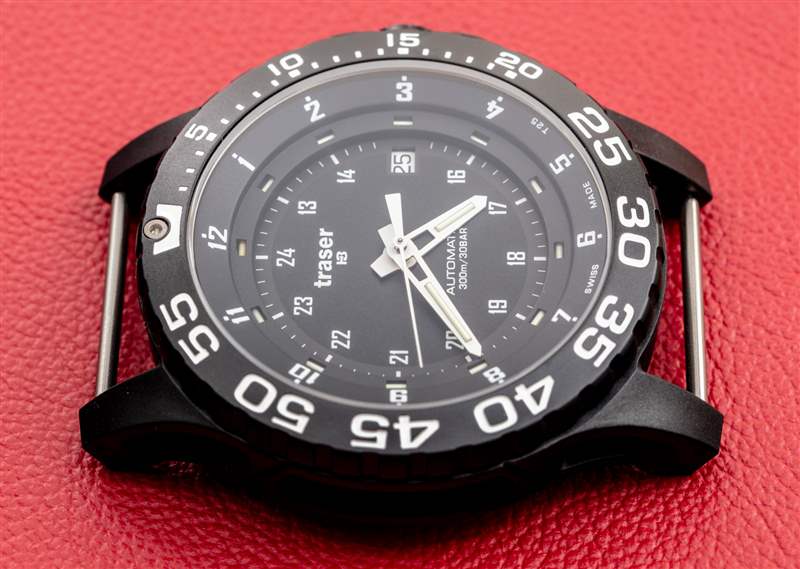 黑色聚合物外殼的側(cè)邊部分采用鏤空設(shè)計(jì),以展示內(nèi)部的噴砂精鋼表殼。表盤周圍是一個(gè)單向旋轉(zhuǎn)計(jì)時(shí)表圈,在 60 分鐘標(biāo)記處有一個(gè)氚氣管流明點(diǎn)。總的來說,擋板有一個(gè)不錯(cuò)的動(dòng)作。說到 lume,盡管 Traser 歸制造氣管的公司所有,但這款特殊的手表并不像現(xiàn)在其他一些配備氚氣管的手表那樣充滿氣管和照明。Traser 不追求最大亮度,而是追求最大實(shí)用性和實(shí)用性。在黑暗中的可讀性很好,但手表并沒有試圖用它的氣管給任何人留下深刻印象,就像你在 Ball 手表中看到的那樣。