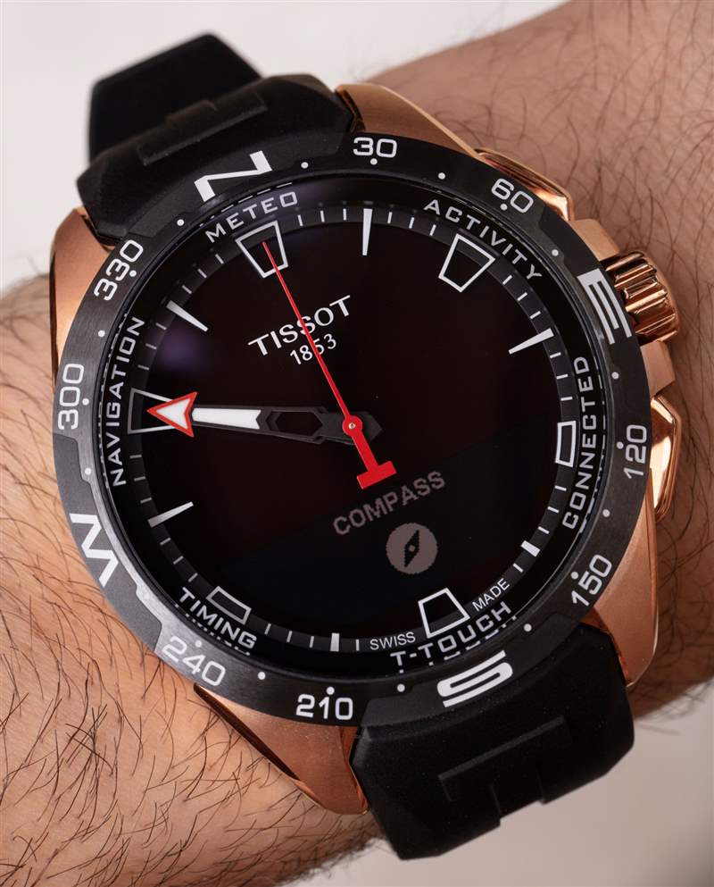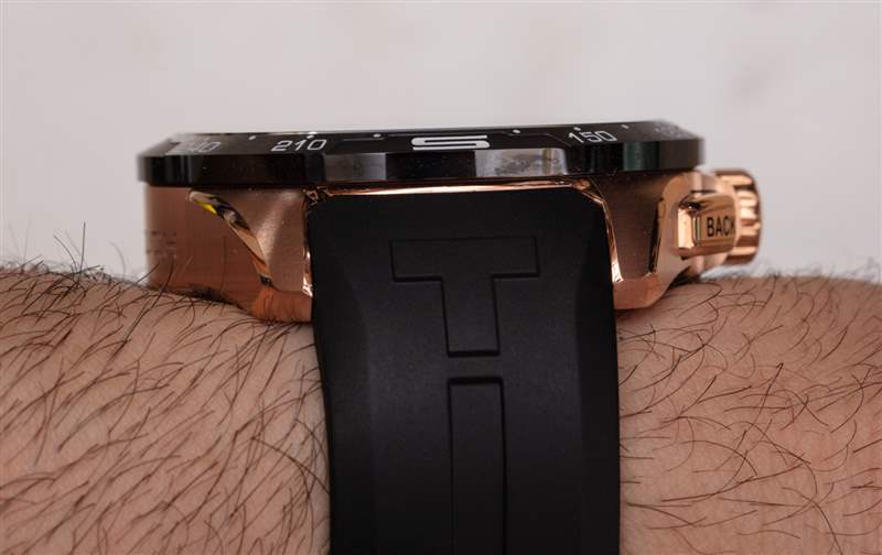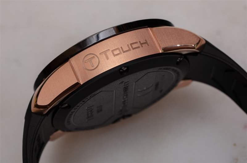 T-Touch Connect Solar 是一款戴在手腕上的大型手表,但佩戴起來非常舒適,尤其是在舒適的橡膠表帶上。這款手表也比你想象的要輕,因為鈦金屬表殼是 PVD ??涂層,帶有玫瑰金色調。擋板采用黑色陶瓷制成(帶有發光的導航標記)——這很重要,這樣它正下方的天線就可以接收信號。即使設計略有老化,T-Touch 表殼(尤其是表鏈上的表殼)也為現代互聯時計提供了出色的基礎。廣告訊息廣告信息結束