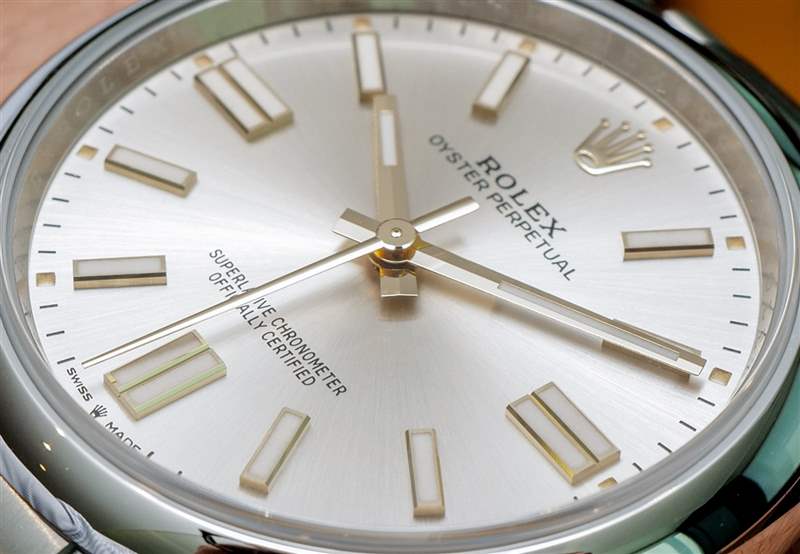 勞力士更新了蠔式恒動(dòng) 41 表盤,而不僅僅是新顏色。2020 年,3 點(diǎn)鐘、6 點(diǎn)鐘和 9 點(diǎn)鐘位置的時(shí)標(biāo)采用“雙條”設(shè)計(jì),尺寸更大,視覺上營造出更熟悉 Submariner 的外觀——表盤上有不同的時(shí)標(biāo)形狀。許多收藏家可能會(huì)注意到蠔式恒動(dòng) 41 上存在“雙條”時(shí)標(biāo)。毫無疑問,他們會(huì)注意到新的顏色選項(xiàng)。其中最大膽的是黃色、綠松石色和“珊瑚紅”表盤顏色。124300 腕表還提供傳統(tǒng)的“亮黑色”、帶有金色標(biāo)記和指針的銀色、深金屬色“亮藍(lán)色”和森林綠色表盤顏色選項(xiàng)。在我們與勞力士會(huì)面時(shí),他們并沒有全部 41 毫米寬的表盤顏色版本