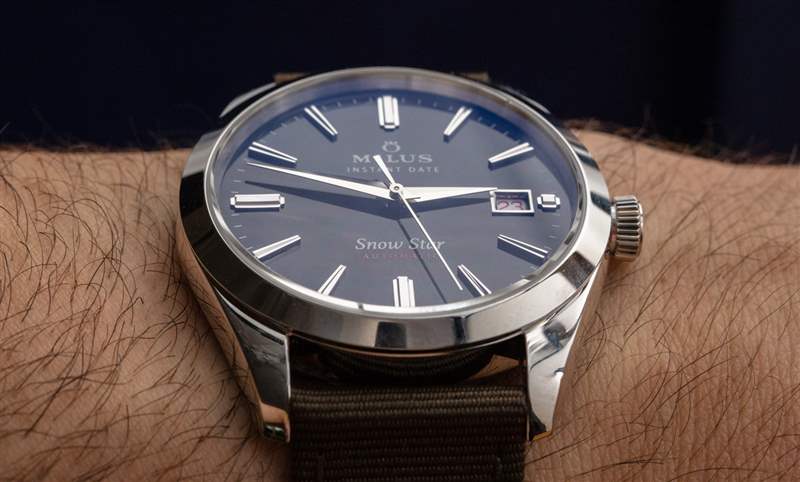 Snow Star Black 寬 39 毫米且相對纖薄,具有輕松通用的休閑外觀。它不會小到讓人感覺復古,也不會太大而不被認為是正式或正裝手表。Milus 喜歡將 Snow Star 定位為具有運動魅力的復古風格日常佩戴時計。這可以從品牌的營銷以及手表隨附的軍用色調橄欖綠色織物表帶中看出。表帶很好,但不是每個人都喜歡。它帶有快速釋放條,因此任何獲得這款手表的人都應該立即想到他們想在雪星上使用什么 20 毫米寬的表帶,以便為自己個性化。