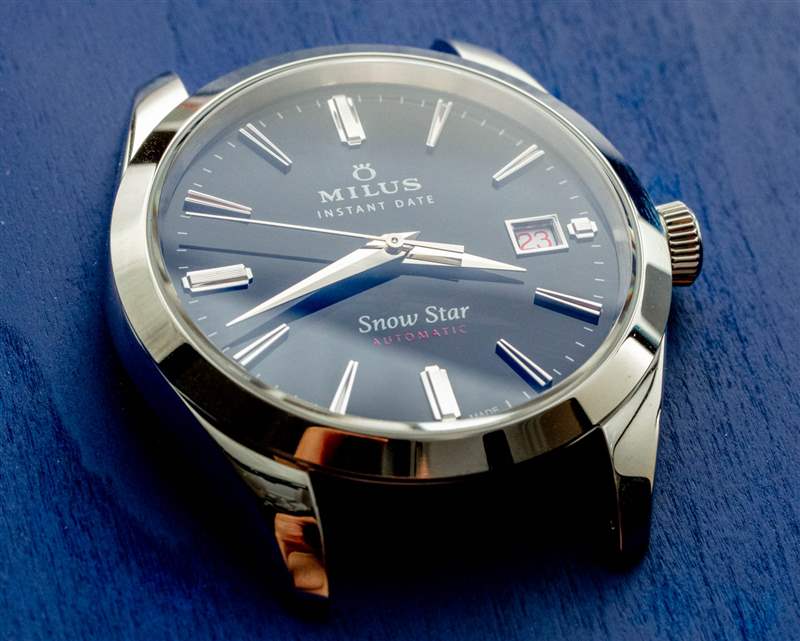 100 米的防水性能(帶有旋入式表冠)和表盤上的 AR 涂層藍寶石水晶有助于使 Snow Star 更具運動感的一面更加完美。底蓋相對簡單,我希望有一個可以看到機芯的展覽窗。有問題的機芯是瑞士 ETA 2892-2 自動機芯,Milus 將其用于目前的大量生產。這些比 2824 自動裝置的質量更高,2824 自動裝置具有大約兩天的動力儲備,以 4Hz 的頻率運行。根據 Milus 的說法,他們為每個裝飾(拋光和藍色螺絲)的 2892 機芯配備了一個定制的鏤空自動轉子,上面刻有 Milus 的名字。同樣,您無法通過底蓋查看機芯是一個小小的遺憾。在表盤上,機芯通過表盤 3 點鐘位置的鏤空窗口顯示時間和日期。紅色的日期數字很漂亮。