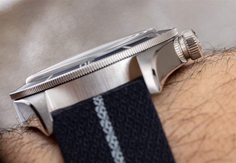 39 毫米寬的表殼是同價(jià)位中最好的鋼材精加工工作之一。表殼結(jié)合了拋光和拉絲表面,并在表耳上增加了拋光角度(角度)。這在設(shè)計(jì)上并不是什么革命性的東西,但它是您在這個(gè)價(jià)位上可以在鐘表中看到的一些最好的結(jié)果(如果不是最好的話)。表冠上方是刻在側(cè)面的都鐸王朝“玫瑰”標(biāo)志。