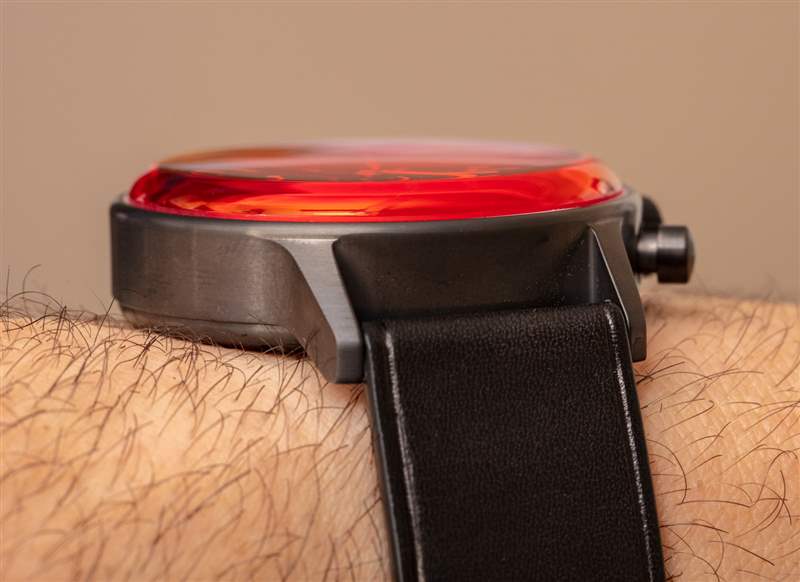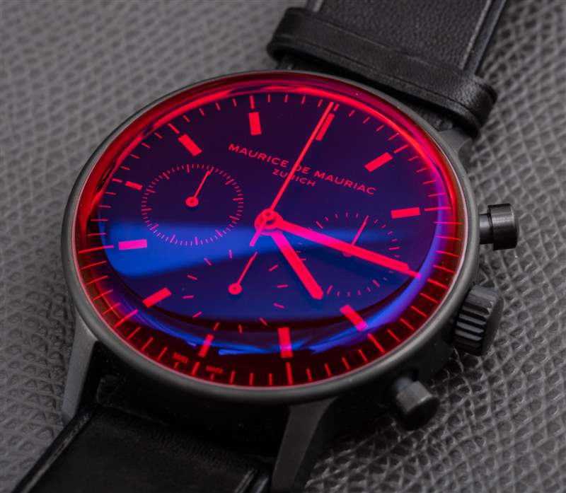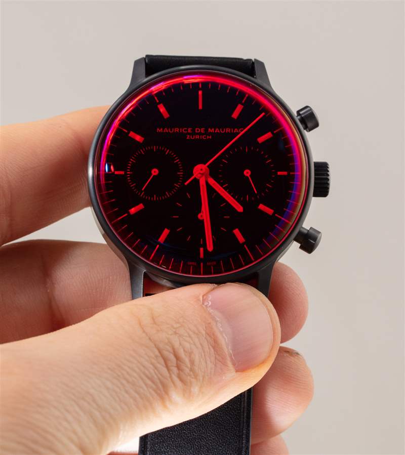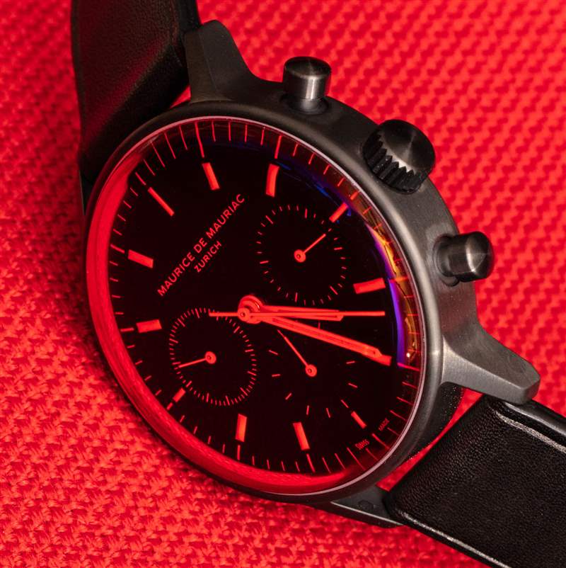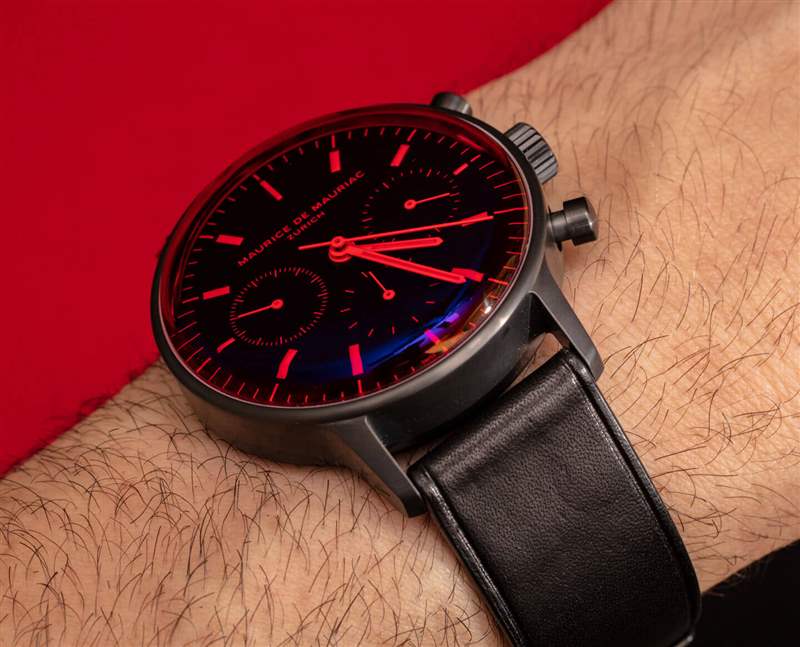 L3 Chronograph 表殼寬 40.5 毫米,厚約 13-14 毫米,表耳到表耳的距離約為 48 毫米,表帶的表耳寬度為 20 毫米。表殼防水僅為 30 米——不幸的是,這不是一款適合游泳的運動手表。這種特殊版本的精鋼表殼采用 DLC 涂層,呈現無煙煤色(不是完全黑色),使其外觀更光滑、更柔和,并與水晶完美搭配。說到紅水晶,我確實提到這是 Maurice de Mauriac 帶回的設計美學。2011 年,我在回顧Maurice de Mauriac Chronograph Modern Tactical Vision 手表時首次介紹了該品牌的這一非常酷的趨勢。兩年后的 2020 年,我回顧了一款帶有紅水晶的手表,即Maurice de Mauriac Chronograph Modern Travel Timer.?事實上,就在莫里斯·德·莫里亞克 (Maurice de Mauriac) 透露這款今天首次亮相的帶有紅色水晶的 L3 計時碼表的幾周前,我問,“現在是時候帶回一些彩色水晶了嗎?”?看起來他們在那方面比我領先一點。