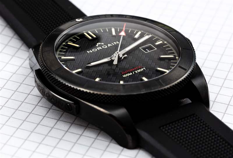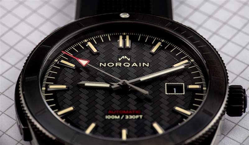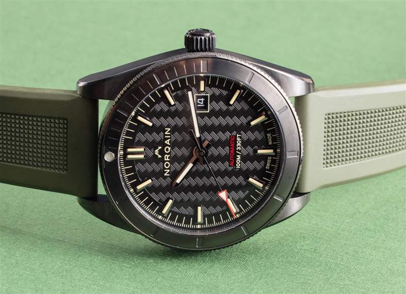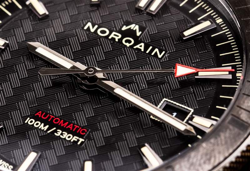 Adventure Sport DLC 表盤效果很好,因為它首先應(yīng)用了模擬表盤易讀性和比例的久經(jīng)考驗的真實規(guī)則。時針和時標在臉上形成鮮明對比,指針大小都合適。盡管 Norqain 為表盤本身使用了特殊的紋理,但它只是增強了表盤的個性,卻不影響核心的可讀性(紋理在現(xiàn)實生活中比 Norqain 的營銷照片中的紋理更微妙)。我也喜歡 Norqain 選擇用于指針和時標上的發(fā)光顏色的米白色奶油色。他們稱這種顏色為“老鐳”,這很有趣,因為實際的鐳既具有放射性又很危險。(這是 Super-LumiNova。)純白色看起來不會那么有趣,