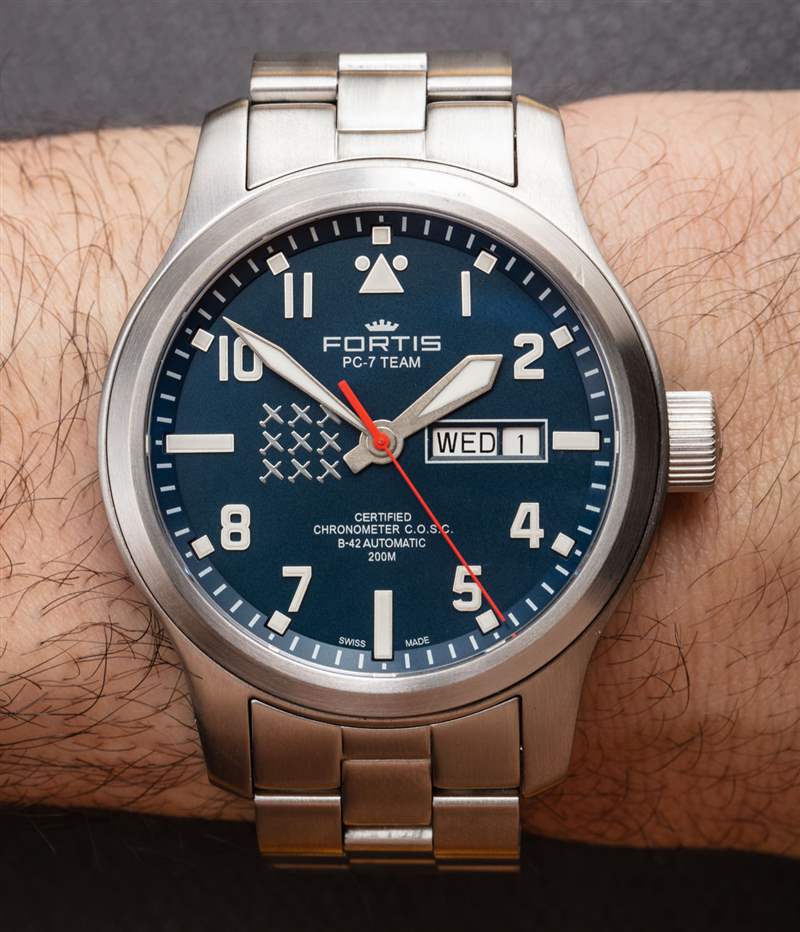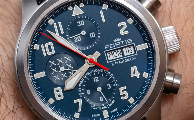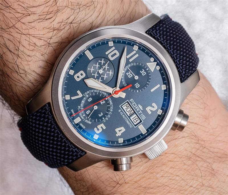 任何尋求具有良好歷史基礎(chǔ)和大膽但不過(guò)度尺寸比例的略帶現(xiàn)代飛行員風(fēng)格計(jì)時(shí)碼表的人都應(yīng)該考慮 Aeromaster 時(shí)計(jì)系列。Aeromaster 系列中目前最昂貴的型號(hào)不是這些限量版 PC-7 Team 型號(hào),而是 Aeromaster Alarm Chronograph,它為基礎(chǔ) Valjoux 7750 增加了機(jī)械報(bào)警功能,由 Paul Gerber 為 Fortis 完成。限量版每件 300 件,零售價(jià)高于非限量版 Aeromaster 型號(hào)。Fortis 確實(shí)提供了表帶/手鏈組合,但如果這些藍(lán)色表盤(pán) PC-7 Team 型號(hào)的價(jià)格和款式不完全適合您的口味,則值得關(guān)注更大的 Aeromaster 系列。盡管如此,任何手表愛(ài)好者都可以同意,富通目前的 Aeromaster 系列不僅僅是體面的東西。