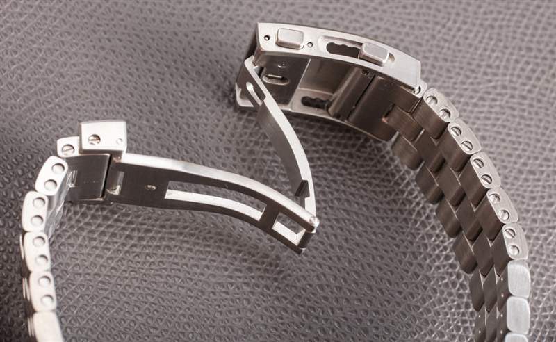兩款限量版 PC-7 Team Aeromaster 腕表均配有金屬表鏈和定制表帶。雖然我主要是手鐲愛(ài)好者,但我實(shí)際上更喜歡這款手表的表帶。那不是因?yàn)槭骤C有什么問(wèn)題,而是更多關(guān)于它如何適合表殼。手鐲有點(diǎn)突出,使得手表在較小的手腕上佩戴起來(lái)不那么優(yōu)雅,比如我自己的手腕。不同款式的表帶更適合較小的手腕。除了外觀有點(diǎn)普通外,手鐲制作精良。鏈節(jié)使用更大尺寸的螺釘連接,展開(kāi)式表扣還包括一個(gè)微調(diào)系統(tǒng)。我真的認(rèn)為 Fortis 整體上對(duì) Aeromaster 系列有所了解,但它可能會(huì)受益于添加一些尺寸略小且整體比例更薄的型號(hào)。