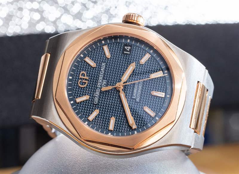 Laureato 表盤是我的最愛,它以 Clos du Paris 圖案紋理表盤和大膽的指針和時標開始。我最不喜歡 Nautilus 的表盤,但我也喜歡最現代的皇家橡樹表盤,指針和時標都經過了令人愉悅的現代化改造。我喜歡 Girard-Perregaux 為這款手表和表盤顏色制作了一個完全定制的日期輪是多么明顯。