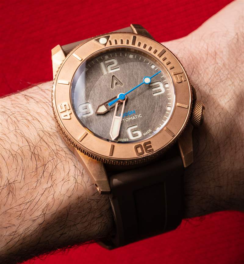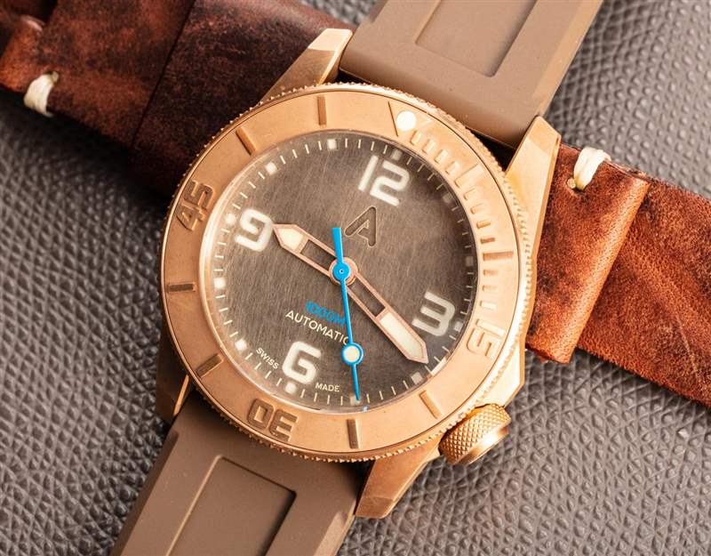 Andersmann Bronze 腕表的寬度為 44 毫米,厚度也為 16 毫米(僅圓頂藍寶石水晶表鏡的厚度為 4.4 毫米),表耳到表耳的距離為 52 毫米。手表防水1000米。較大的深海可防水 3000 米。這些都不重要,因為沒有人潛水到 1000 米,更不用說 3,000 米了。作為一款潛水表,Bronze 具有單向旋轉表圈,操作良好,并且在 60 分鐘標記處有一個夜光點。我繼續欣賞 4 點鐘位置的表冠,這樣它就不會伸入您的手腕。