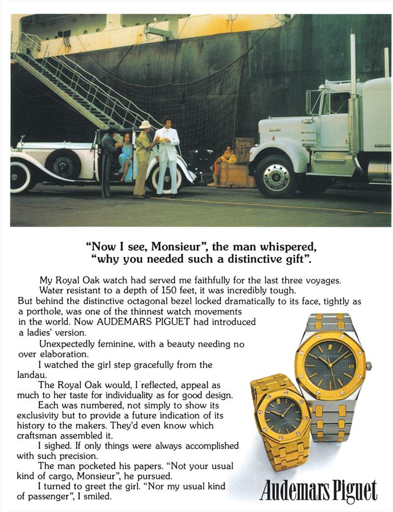 愛彼 (Audemars Piguet) 在 1970 年代初期通過大膽的營銷活動推出了皇家橡樹(當時,手表品牌心甘情愿地理解在手表周圍創造廣告個性的重要性,而不僅僅是美學設計,這是一種令人遺憾的失傳藝術)。營銷活動的重點是 Audemars Piguet 以金表的價格出售 Royal Oak 鋼表這一大膽事實。為什么雄心勃勃的定價?因為愛彼將手表的構造和裝飾視為復雜的珠寶,而不是戴在手腕上的表帶上的小懷表。為什么愛彼首先生產皇家橡樹?我的理解是,這是為了安撫意大利的手表經銷商(總是時尚前衛),他們希望為那些活動需要運動手表的富有客戶提供優質手表。