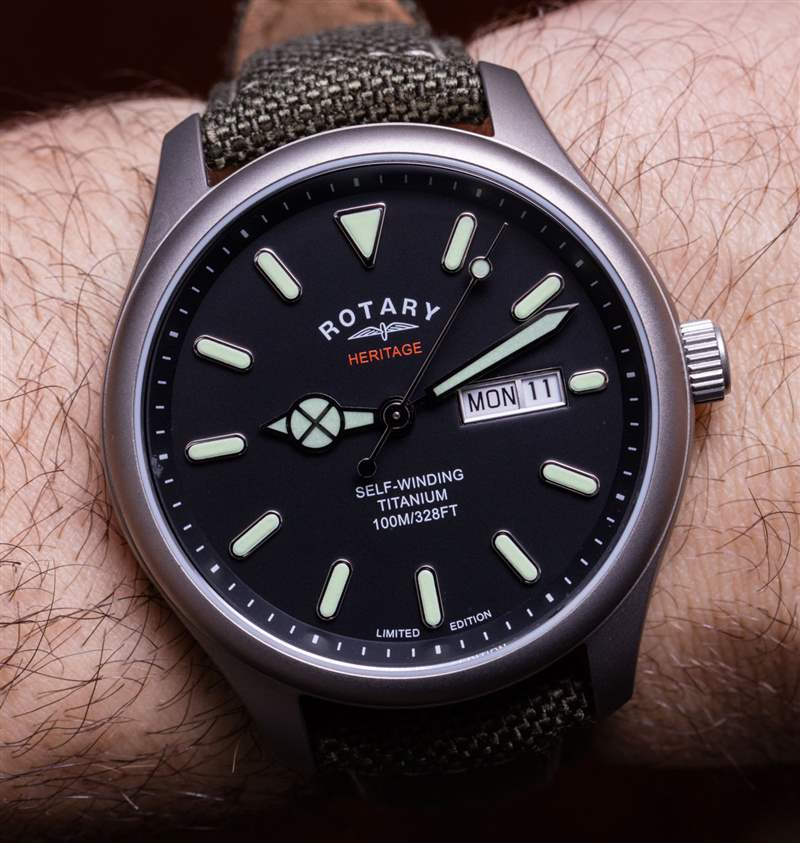 為了紀念這一時刻,Rotary 發布了一些限量版手表,它們看起來和戴在手腕上一樣體面。其中最運動的(截至 2020 年初)是這款 Rotary 限量版 Heritage Titanium Automatic 參考 GS05249/04。雖然我通常喜歡這款手表,但我發現使用“Heritage”這個詞時這個名字有點誤導。當然,這個詞并不是一個承諾,但它似乎暗示這是一款歷史性時計的翻版——據我了解,這并不完全正確。相反,Rotary 制作了一款現代手表,其表盤靈感來自復古軍用設計。” 我確實相信,過去,Rotary 是英國軍方的手表供應商。廣告訊息廣告信息結束