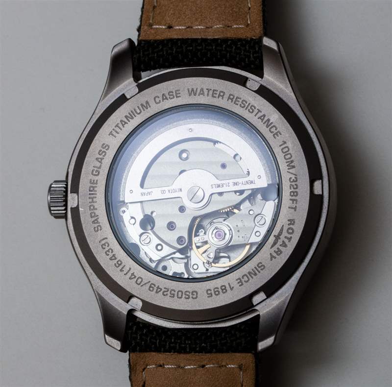 表盤上還有一個整齊插入的日期/日期窗口,它有一個適當的框架,盡管日期和星期幾信息可能對所有人來說都太小了,除了最好的眼睛。作為保持成本合理的一部分,手表包含一個略微裝飾且可見(通過底蓋窗口)的日本 Miyota 8000 系列自動機芯。該機芯以 3Hz 的頻率運行,具有約 2 天的動力儲存,對于機械機芯來說無疑是入門級的。Rotary 確實選擇了更好等級的 8000 系列機芯,而且在較大的表殼中,機芯不像其他一些手表那樣響亮。也就是說,鑒于這款手表的整體外觀非常漂亮,很高興看到 Rotary 通過 Heritage Titanium Automatic 內部的機制進一步提高賭注。由于這是限量版,看來該品牌將來可以簡單地生產帶有其他機芯的略微修改版本。我并不是說 Rotary 會這樣做,但它當然可以選擇將 GS0549/04 作為系列的一部分,而不是獨立產品。