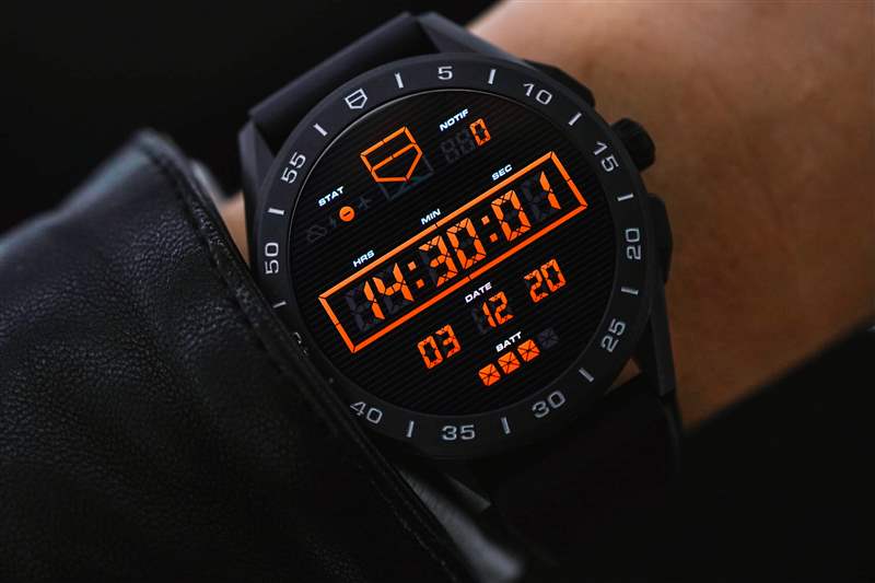 TAG Heuer Connected 智能手表預裝了一系列模擬和數(shù)字風格的“表盤”。每個人都有獨特的風格,總的來說,他們做得很好,沒有明顯的贏家。我確實喜歡 TAG Heuer 混合使用新概念以及制作相當精致的模擬表盤數(shù)字版本。該系統(tǒng)還支持常亮屏幕,它在“空閑”狀態(tài)下不會超亮,但足以讓佩戴者輕松閱讀(只是很難用相機拍攝)。與泰格豪雅交談,很明顯設計團隊將定期推出新的智能手表表盤,用戶可以通過泰格豪雅 Connected 應用程序下載這些表盤。