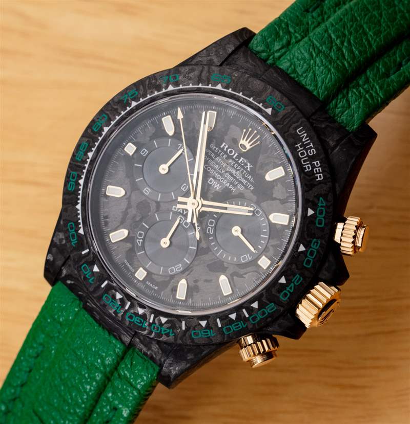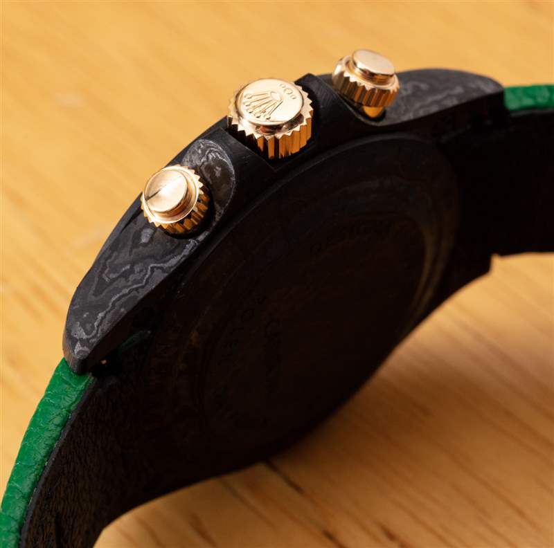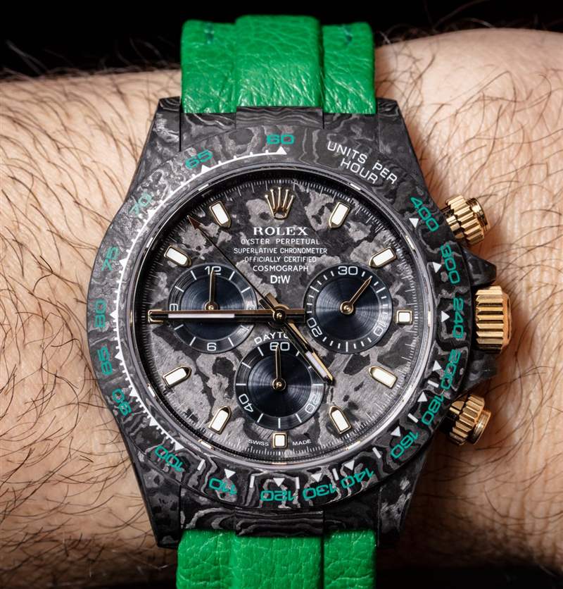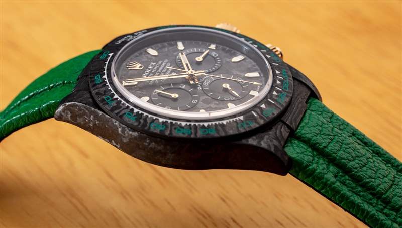 這一切都讓我親身體驗(yàn)了一家名為 Designa Individual 的公司的售后市場(chǎng)改裝勞力士蠔式恒動(dòng)宇宙計(jì)型迪通拿,該公司將其稱為“碳翡翠”。這是我處理過的許多售后勞力士手表之一。然而,這是我第一次看到全碳外殼。該公司對(duì)碳表殼的精確切割感到非常自豪,它具有優(yōu)雅的質(zhì)感,與金屬代托納手表相比非常輕巧。Designa Individual 似乎有點(diǎn)像 Richard Mille 的主題,但采用的是定制的 Daytona。它很有效,18k 黃金、黑碳和綠色表帶的組合營(yíng)造出非常有靈感的外觀。請(qǐng)注意,Designa Individual 提供少量限量版勞力士迪通拿,帶有碳纖維表殼和綠色以外的顏色(和表帶)。碳翡翠是,