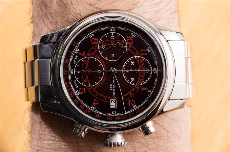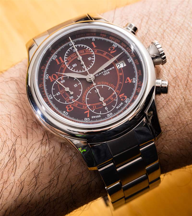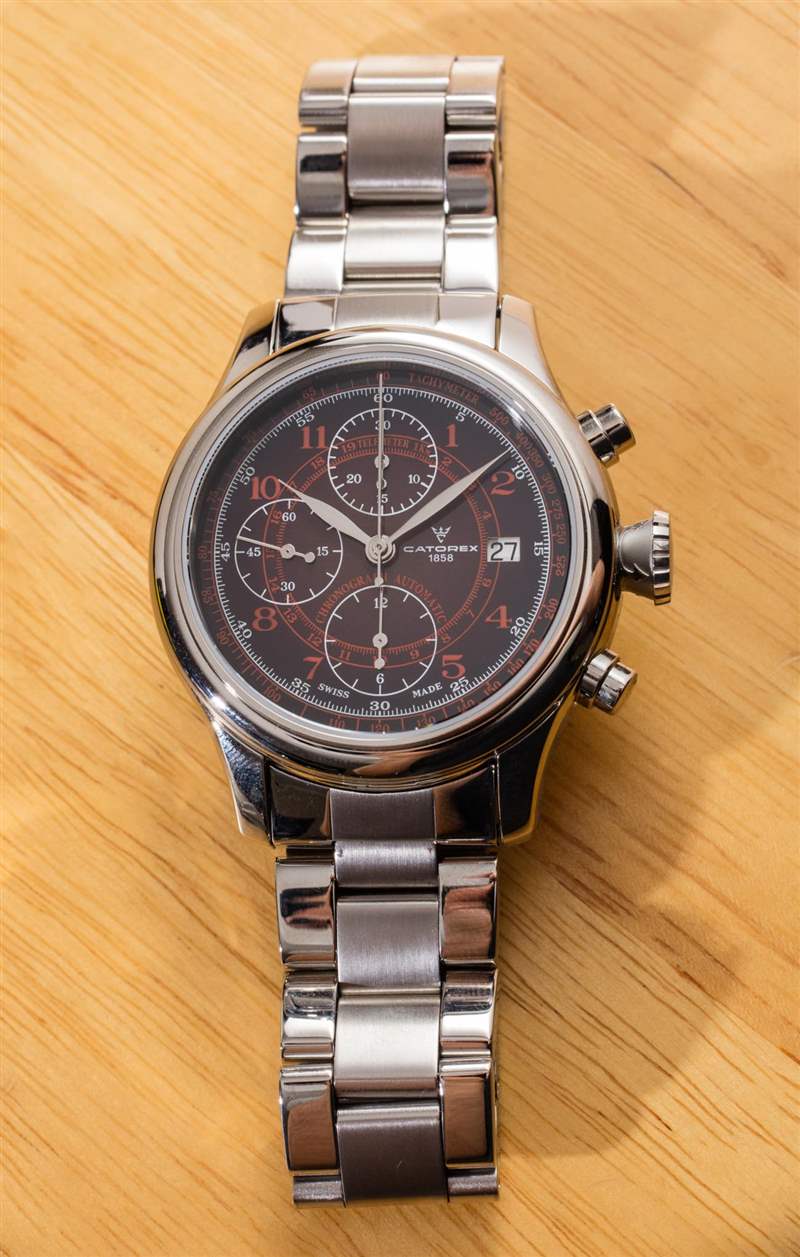 這款煙熏紅色表盤模型總體上相當不錯,但我有兩個抱怨。首先是拋光鋼指針很難在表盤上閱讀。其他版本的 Krono Classic 42 手表都有涂漆的指針,我認為這應該轉化為更好的易讀性。作為一款經典/運動風格的手表,這是一個很好的組合,但 Catorex 制造的其他型號可能會更清晰。將來,Catorex 可以輕松解決這個問題,并通過簡單地更換聽筒來使 Krono Classic 42 的這個表盤更好。