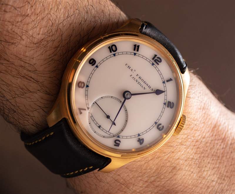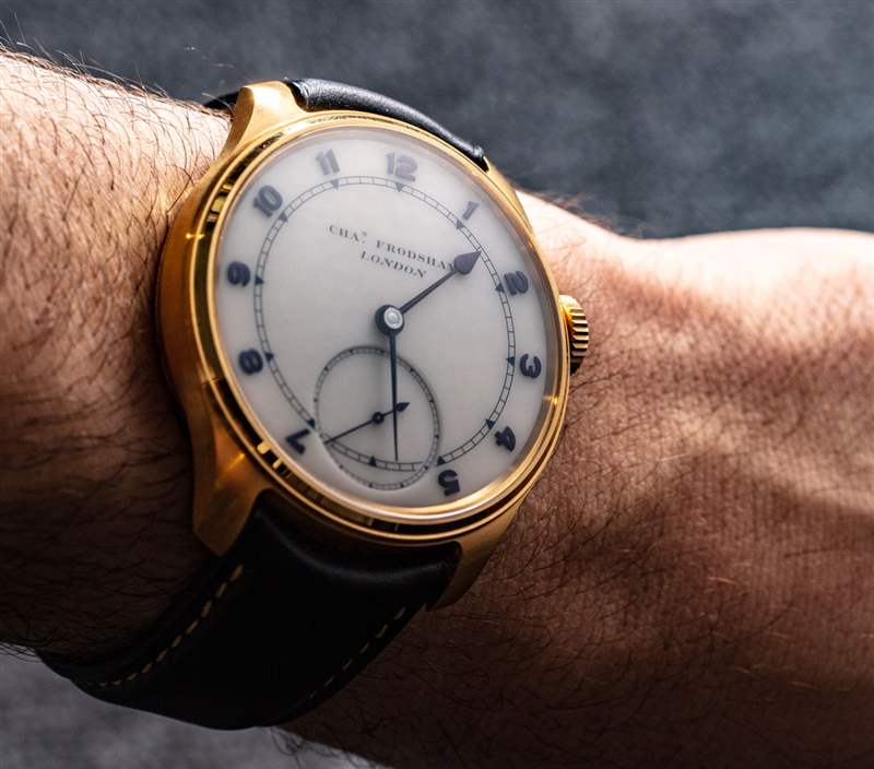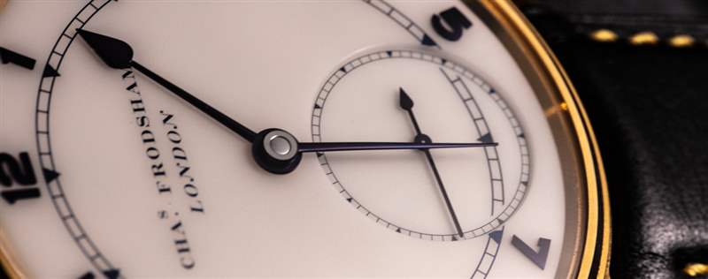 在表盤上,機芯的特點是帶有漂亮的小秒盤。白色表盤由陶瓷制成(一種很好的當代琺瑯替代品),并采用了阿拉伯數字樣式或羅馬數字樣式的時標。如您所見,Double Impulse Chronometer 腕表的指針和時標為火焰色。為了有點“不同”,Charles Frodsham & Co. 使用較輕的火焰觸感,產生紫色,而不是傳統上看到的用于火焰處理金屬的藍色調。