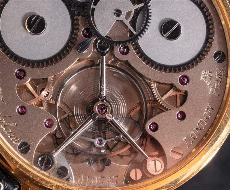該系統有自己的防震系統,軸承非常穩定,運行頻率為 3Hz(21,600 bph),動力儲備為 36 小時。手工裝飾和組裝的機芯需要數小時才能生產,是雙脈沖天文臺產品的真正亮點。磨砂機芯橋板更典型的英國(相對于瑞士)手表機芯設計。帶有蝸牛殼風格圖案的齒輪以及應用箭頭用作手表機芯側的動力儲存指示器。該系統給我留下了相當深刻的印象,盡管我希望看到 Charles Frodsham & Co. 安裝一個更大的主發條盒,因為雙脈沖調節系統似乎是一個動力豬,而且今天的許多手表所有者都期望在僅限時間的手動上鏈腕表可提供至少兩天的動力儲存。