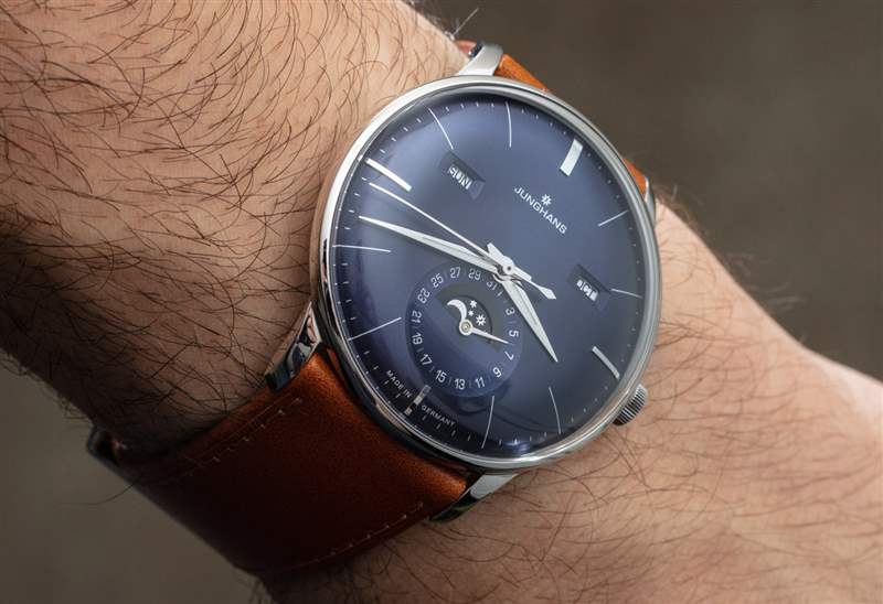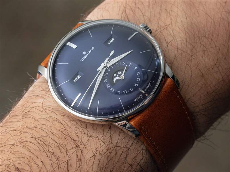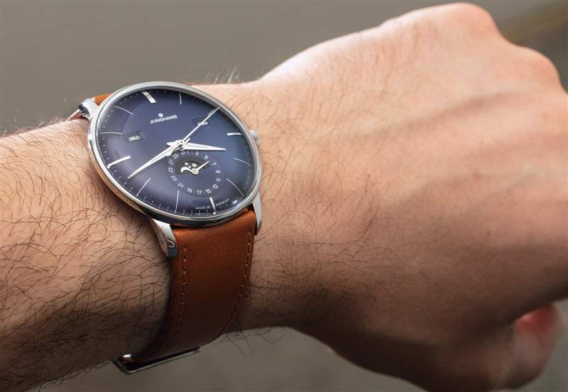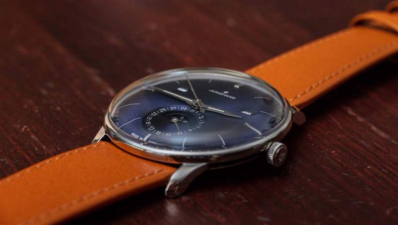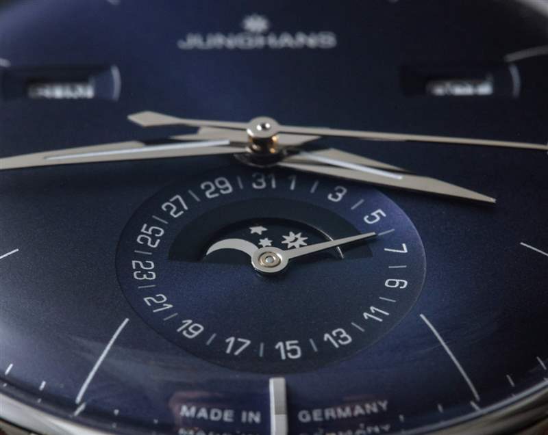作為一款日歷手表,Meister Calendar 提供月份、星期幾、日期和月相指示器。我認(rèn)為機(jī)芯是一個(gè)完整的日歷,在奇數(shù)月需要調(diào)整日歷方面,它有點(diǎn)低于年歷。要調(diào)整日歷設(shè)置,只需使用位于表殼兩側(cè)的小嵌入推桿。我真正喜歡的是信息的傳統(tǒng)對(duì)稱布局,以及窗口的使用(與所有表盤相反)。表盤用于日期指示器,其中有一個(gè)用于月相指示器的窗口。請(qǐng)注意,Junghans 為手表提供英文或德文的日歷信息。