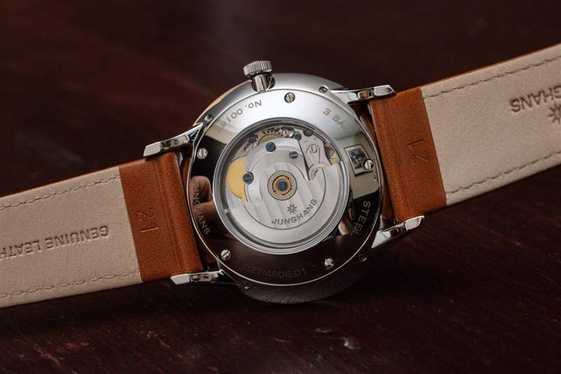 手表內(nèi)部看起來是一個(gè)基本的瑞士 ETA(或等效)自動(dòng)機(jī)芯,上面有一個(gè)用于日歷信息的模塊。Junghans 將其稱為 J800.3 機(jī)芯,其工作頻率為 4Hz,具有 38 小時(shí)的動(dòng)力儲(chǔ)存。您可以通過手表后部查看機(jī)芯及其精美的拋光裝飾。