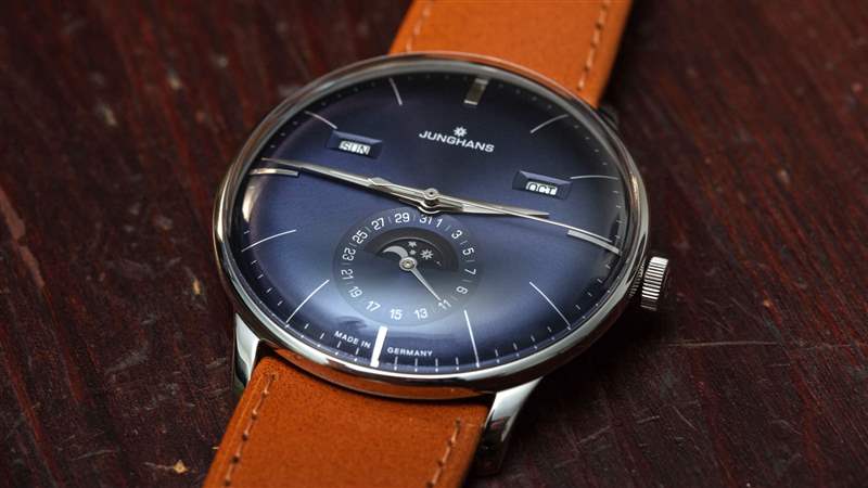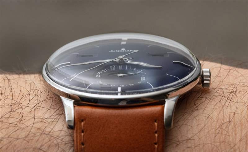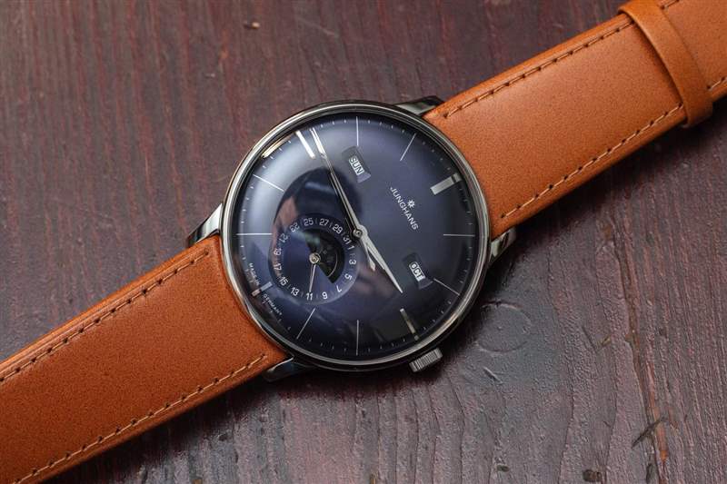 手表上的傳統(tǒng)元素比比皆是,包括與表殼和水晶相匹配的弧形表盤。很少看到用這種弧形表盤生產(chǎn)的手表。令人印象深刻的是,Junghans 能夠隱藏機(jī)芯的相對(duì)厚度,因?yàn)樗扔谢A(chǔ)機(jī)芯,也有日歷信息模塊。太陽(yáng)紋處理過的藍(lán)色表盤帶有近乎紫色的色調(diào),質(zhì)地非常棒,因?yàn)樗幸稽c(diǎn)光澤,但不會(huì)反射造成眩光。