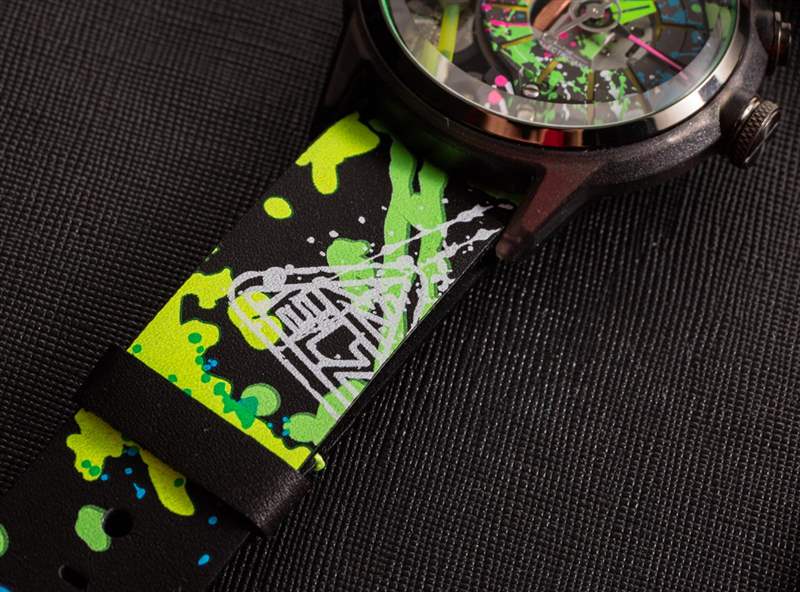 ELECTRICIANZ Neon Z 表帶可能是手表中最好或最差的部分,這取決于您對這些顏色的喜愛程度。我可以原諒這只手表的缺點,因為我手腕上的“涂鴉”大膽聲明,盡管我確實記得大多數涂鴉都是實際的構圖,而不僅僅是油漆飛濺。NATO 風格的表帶實際上是小牛皮,做工精良,戴在手腕上非常舒適。