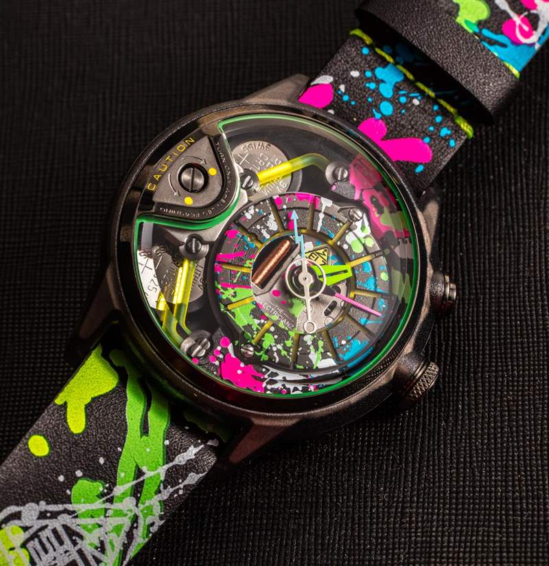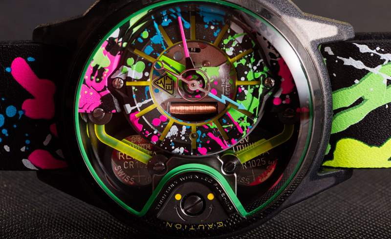 我敢肯定,稍后會詳細介紹高端石英的未來。現在讓我們回到 ELECTRICIANZ Neon Z。外殼尺寸更大,為 45 毫米,帶有鋼質內芯和半透明煙熏尼龍材料外殼。表面定制形狀的水晶采用 K1 礦物水晶制成,帶有霓虹綠色墊圈,使邊緣呈現出發光的綠色外觀。電池穩定器也呈霓虹綠色,表盤與北約風格的表帶一起,被賦予了霓虹噴漆風格的藝術處理。在 1980 年代末和 1990 年代初流行的那種明亮的顏色(我記得很清楚)現在顯然又回來了。我一直認為它很酷(盡管并不總是很有品味,具體取決于上下文)并且很高興看到這樣的美學調色板。我也一直在說“顏色是新的黃金,廣告訊息廣告信息結束