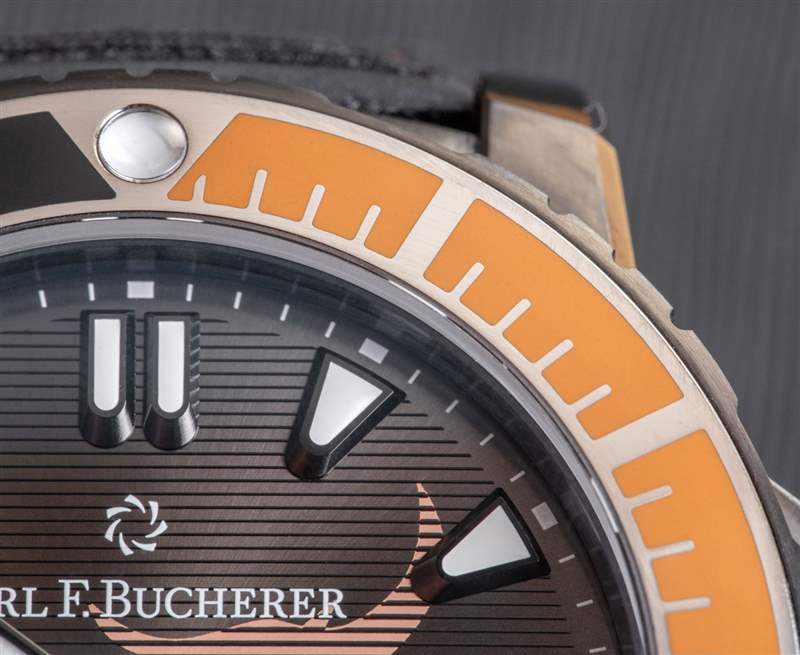這也是卡爾第一次。F Bucherer 用鈦(相對于鋼)制造了它的 ScubaTec——不僅僅是鈦,還有黑色 DLC 涂層鈦。這不僅具有出色的外觀,而且還具有耐刮擦性,這是一個受歡迎的補充。表殼可防水 500 米,帶有自動排氦閥,寬 44.6 毫米,厚約 13.4 毫米。它實際上佩戴起來非常舒適,尤其是在橡膠表帶上。我也喜歡這款手表整體上相對緊湊,適合 500 米潛水員的時計。廣告訊息廣告信息結束