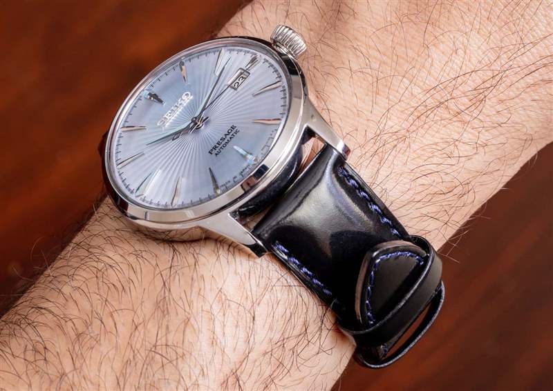 如果沒有一些古怪的東西,它就不會是一款很酷的日本手表。帶有午夜藍色縫線的閃亮漆皮風格黑色表帶是怎么回事?如果您碰巧穿著顏色相配的燕尾服,那么備用肩帶會很適合您——或者如果您的衣櫥里有很多高度拋光的黑色軍用正裝鞋。否則,我認為大多數對這款帶有銀藍色表盤的可愛 Presage Automatic 感興趣的人都會想開始考慮他們理想的表帶選擇。黑短吻鱷或鱷魚也不錯。