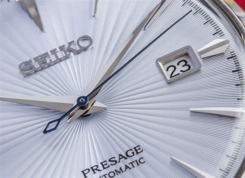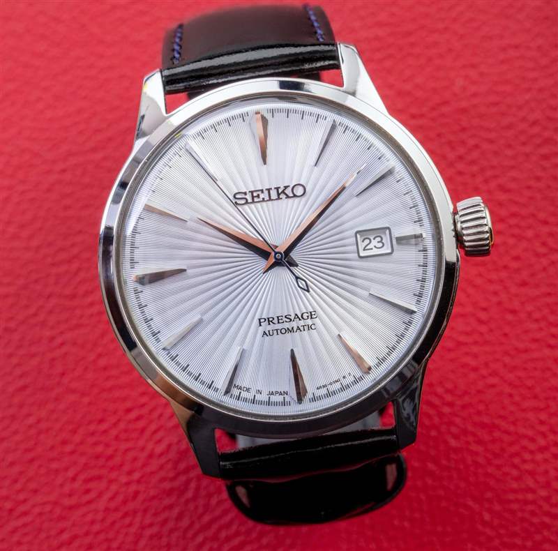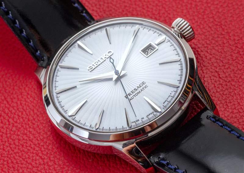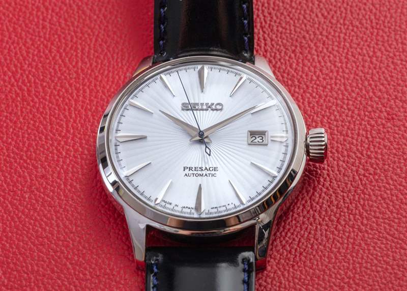 Presage Automatic SRPB43(日本為 SRPB43J1)和 kin 被稱為“精工雞尾酒時間”手表是有原因的。俏皮多彩的旭日形表盤看起來很優雅,而且比那里的許多日本正裝手表更具表現力,尤其是在這些價格下。SRPB43 有一個銀色表盤,在燈光下發出藍色光澤。(選擇深藍色表盤的 SRPB41。)精工提供相同型號的銀色表盤、深灰色表盤、棕色表盤和帶有黑色指針和時標的象牙白,這有點酷。SRPB 作品很容易成為當今整個 Presage 系列中最具個性的作品。