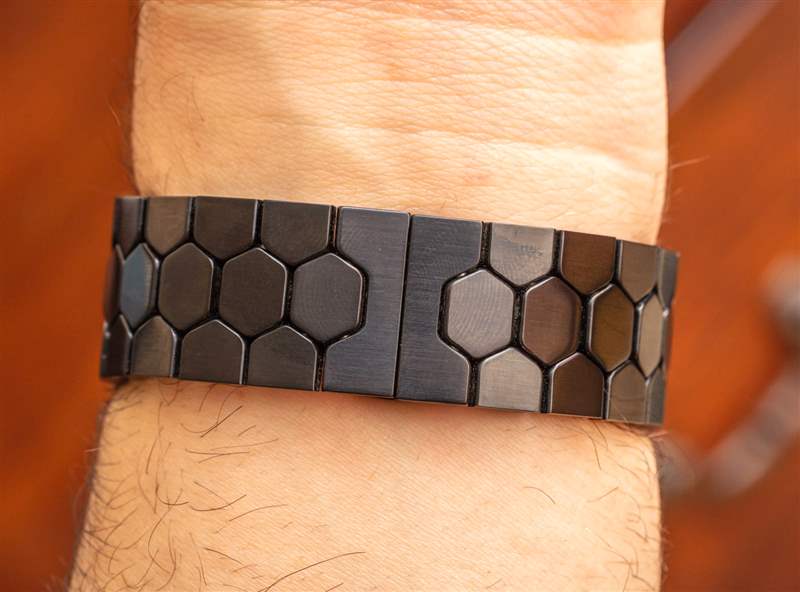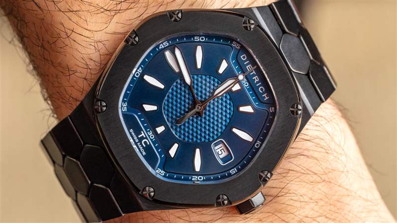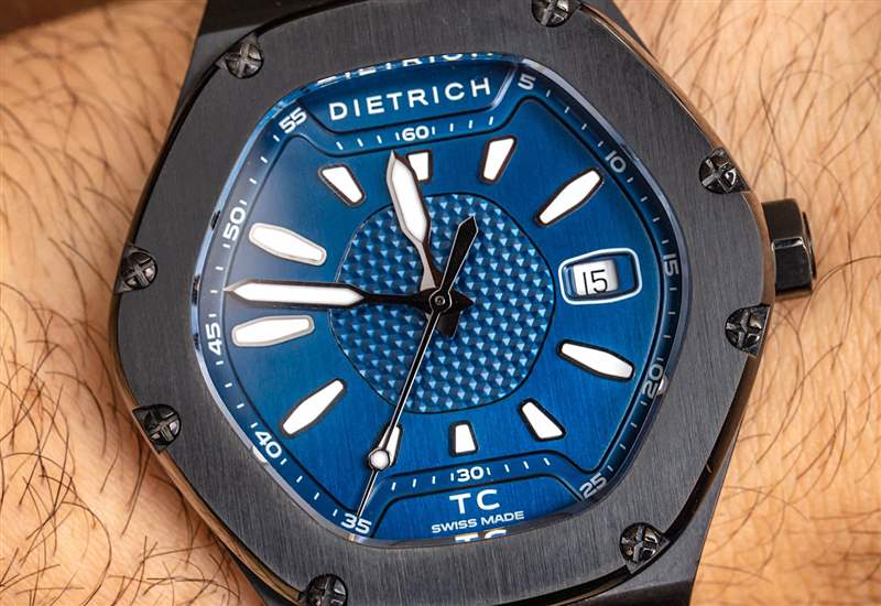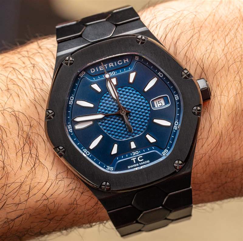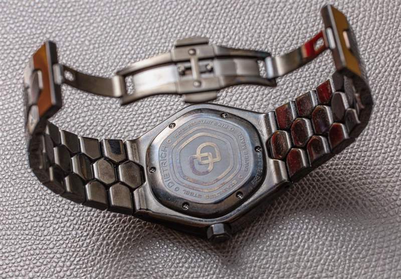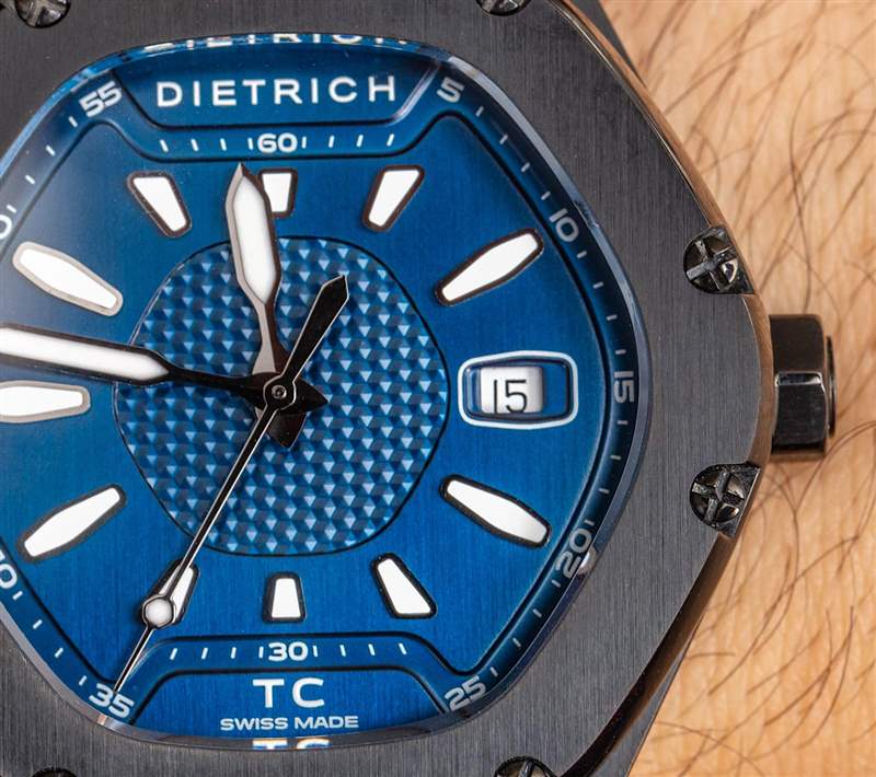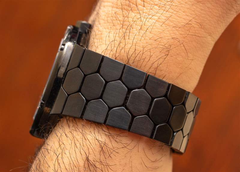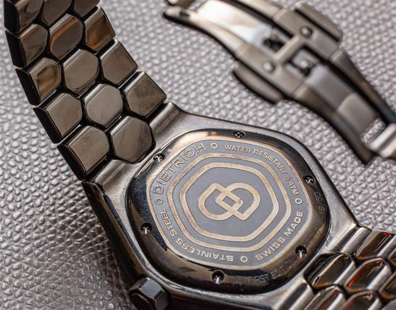 加上表冠,TC 鋼制表殼寬 46.2 毫米,沒有表冠,表殼寬 43.8 毫米,厚度僅為 9.3 毫米??紤]到與表殼的喇叭形側(cè)面相比,表耳變得狹窄,它實(shí)際上磨損了一點(diǎn)。在這里,我們看到迪特里希再次嘗試使用六邊形主題。這款腕表采用定制的藍(lán)寶石水晶表鏡和全鋼表殼和表鏈,重約 166 克,具??有 50 米防水深度和旋入式表冠。